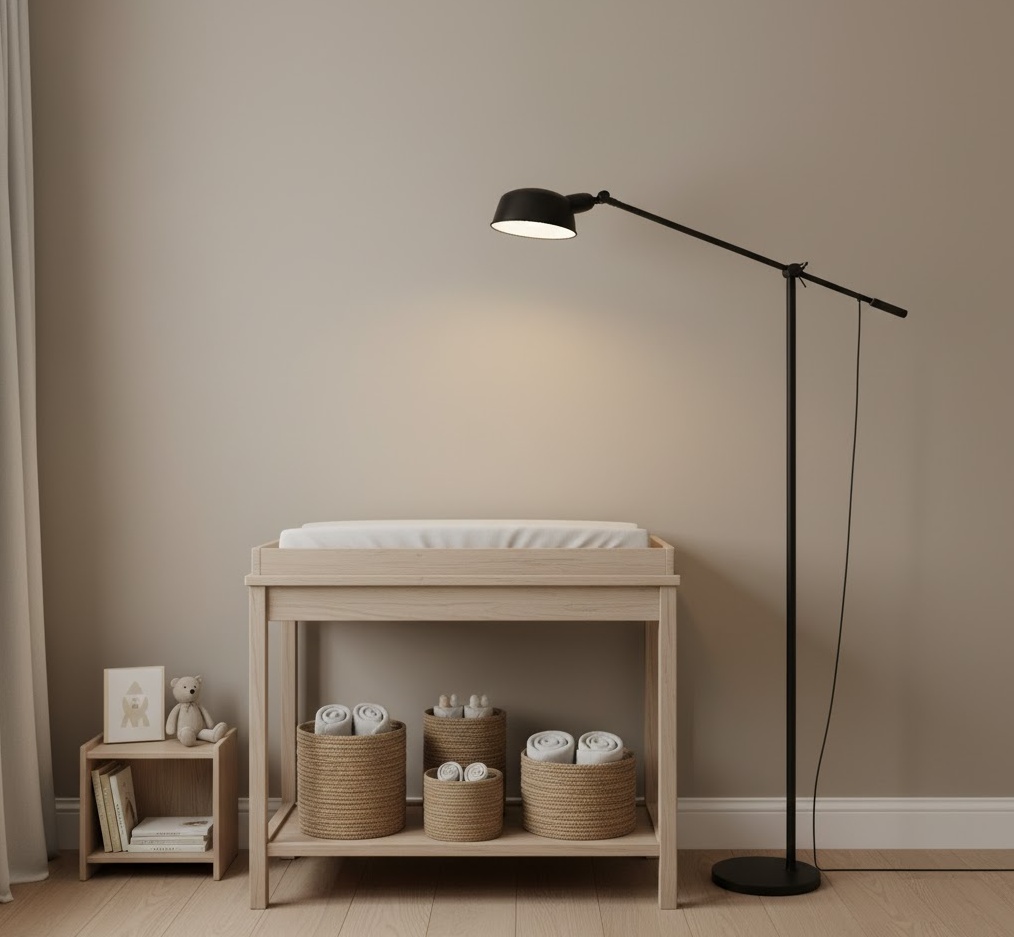 Ensure functionality and safety with practical task nursery lighting, providing focused illumination where it’s needed most. These essential nursery lighting ideas include adjustable floor lamps, clip-on lights for changing tables, or directional spotlights above a reading nook. Materials are often durable metals or plastics, in neutral colours like white, grey, or black, designed for utility. The mood is purposeful and efficient, ensuring parents can perform tasks with ease and precision. Functionally, task lighting prevents eye strain during late-night feeds or nappy changes, offering direct, bright light without disturbing the entire room, making it a crucial addition to any nursery.