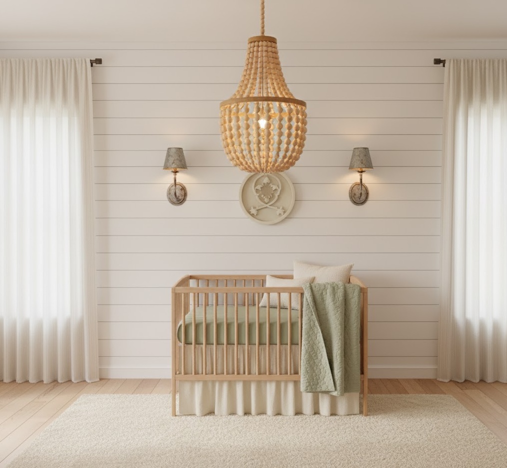 Embrace the warmth and charm of the countryside with rustic farmhouse nursery lighting, creating a cosy and inviting atmosphere. These endearing nursery lighting ideas often feature natural wood, distressed metals, or woven textures, reminiscent of traditional farm aesthetics. Think barn-style sconces, wooden bead chandeliers, or industrial-inspired pendants. Colours typically include muted tones, whites, creams, and natural wood finishes, contributing to a homely feel. The mood is comforting and authentic, perfect for a snug and welcoming nursery. Functionally, these fixtures provide a warm, often diffused light that complements the rustic decor, making the space feel grounded and serene.