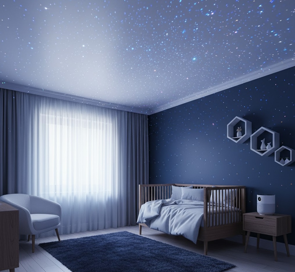 Transform the nursery ceiling into a captivating celestial display with starry night projector lighting, perfect for soothing babies to sleep. These innovative nursery lighting ideas project constellations, nebulae, or moon phases onto walls and ceilings, creating an immersive and magical environment. Often featuring LED technology, they can cycle through various colours and patterns, offering a dynamic visual experience. The mood is enchanting and calming, providing a gentle distraction and a sense of wonder. Functionally, these projectors serve as an excellent night light, helping to establish a peaceful bedtime routine and making the nursery a truly special place.