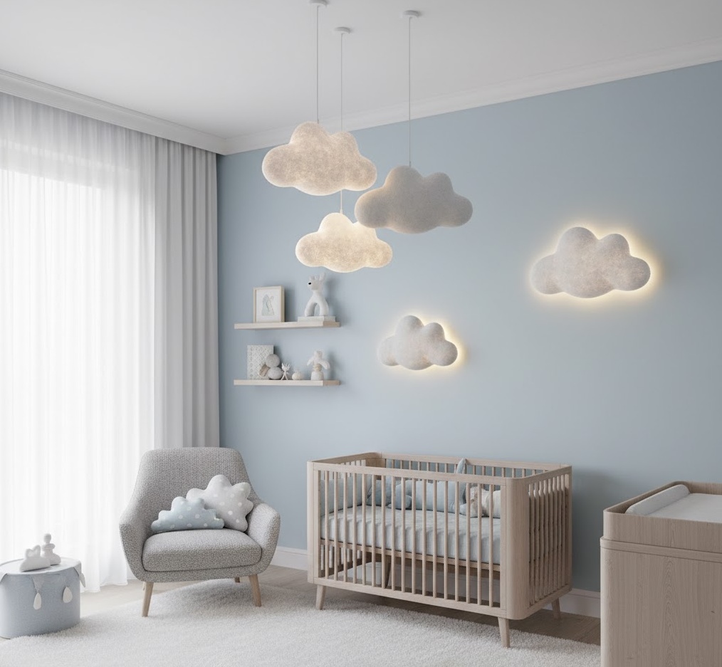 Imagine a nursery bathed in the soft, diffused glow of cloud-shaped light fixtures, creating an ethereal and dreamy atmosphere perfect for a baby’s room. These delightful nursery lighting ideas often feature fluffy, textile-covered shades or LED panels designed to mimic the gentle contours of clouds, bringing a touch of the sky indoors. Materials typically include soft fabrics, felt, or frosted acrylic, often in serene whites, greys, and pastels, ensuring a calming visual appeal. Functionally, they provide a gentle, ambient light that’s ideal for bedtime stories and late-night feeds, avoiding harsh glares and promoting a peaceful sleep environment. This style truly transforms the nursery into a magical, imaginative space.