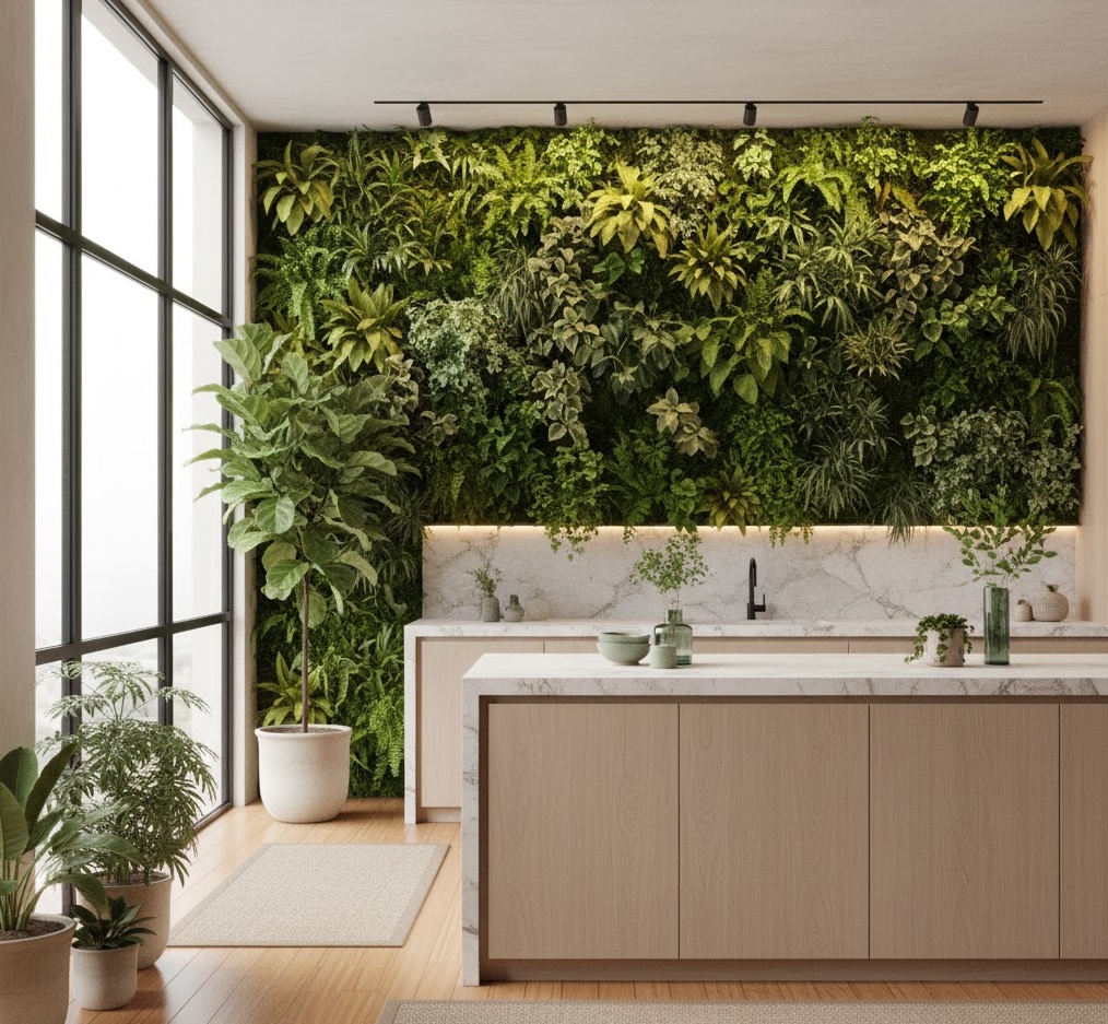 A biophilic open concept kitchen remodel prioritises a deep connection to nature, integrating natural elements and patterns to enhance well-being. It features an abundance of natural light, indoor plants, and materials like untreated wood, natural stone, and bamboo. The colour palette is inspired by nature, with greens, earthy browns, and blues dominating, complemented by crisp whites. Large windows or glass doors are crucial for maximising views and natural light. This design creates a calming and refreshing atmosphere, seamlessly blending the culinary space with the outdoors for a truly harmonious and healthy living environment.