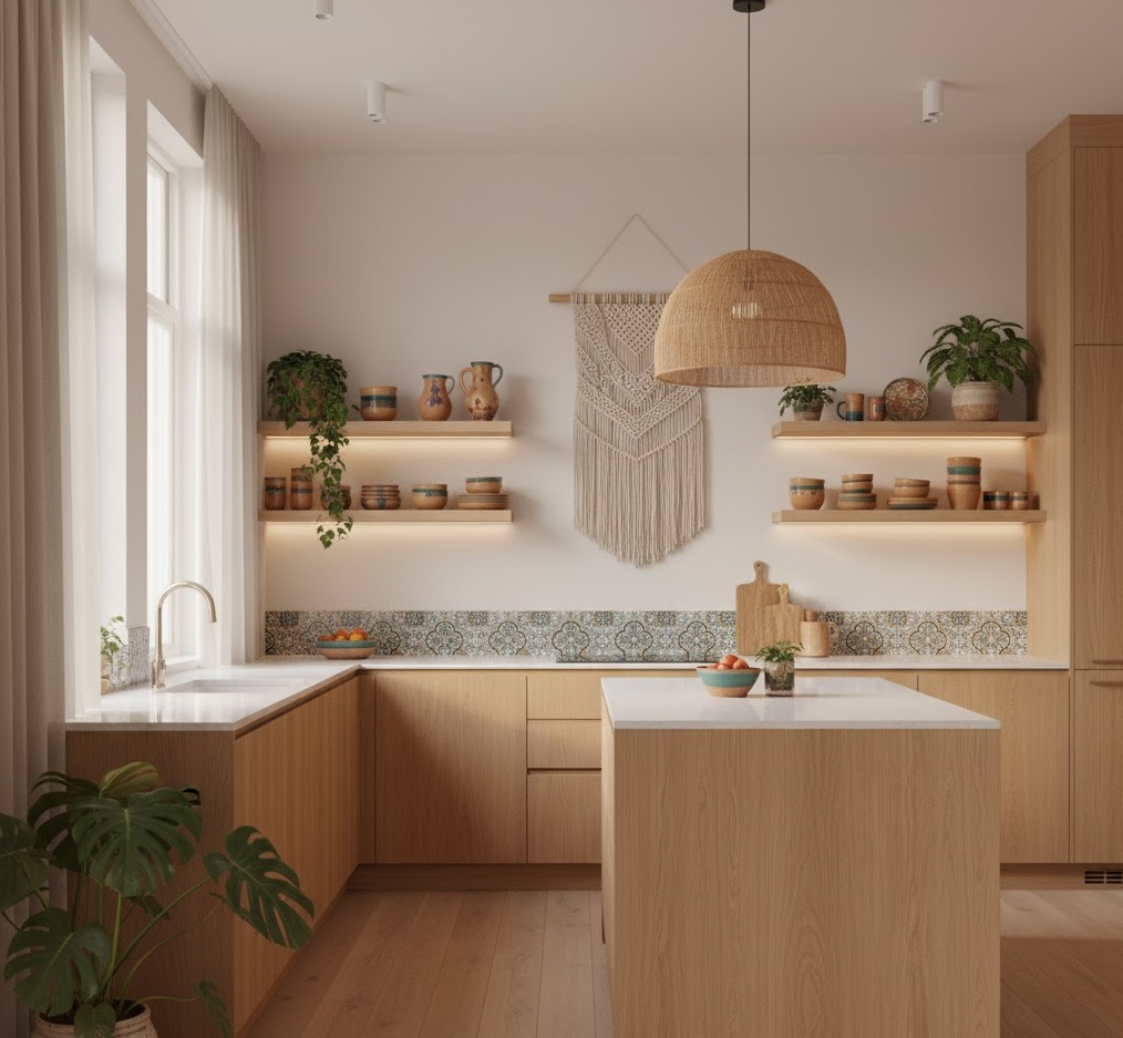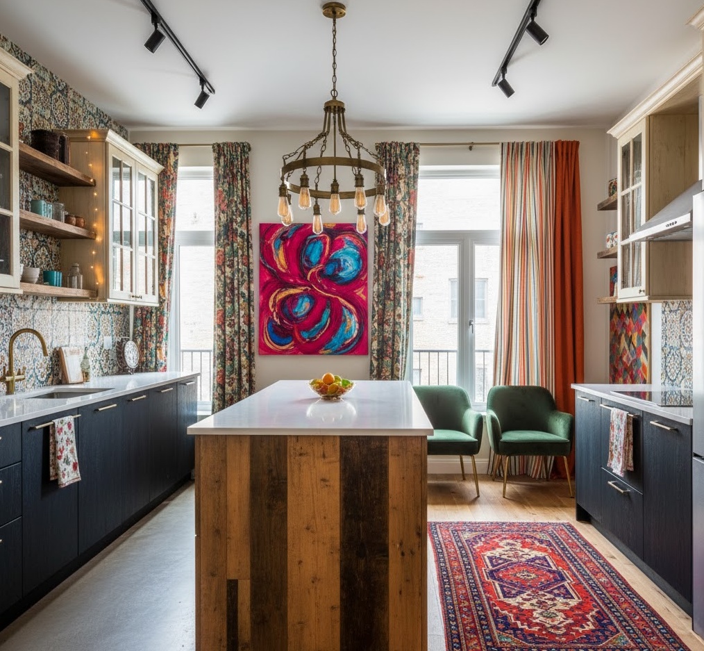 This open concept kitchen remodel exudes a free-spirited and eclectic charm, blending global influences with a relaxed, artistic vibe. It often features a mix of natural materials like rattan, macrame, and reclaimed wood, alongside vibrant patterns and textures. The colour palette is typically warm and earthy, with pops of rich jewel tones or bright, cheerful hues. Open shelving displaying unique pottery and plants is common, adding to the informal and inviting atmosphere. This design encourages creativity and personal expression, creating a unique and comfortable open concept kitchen that feels lived-in and full of character.