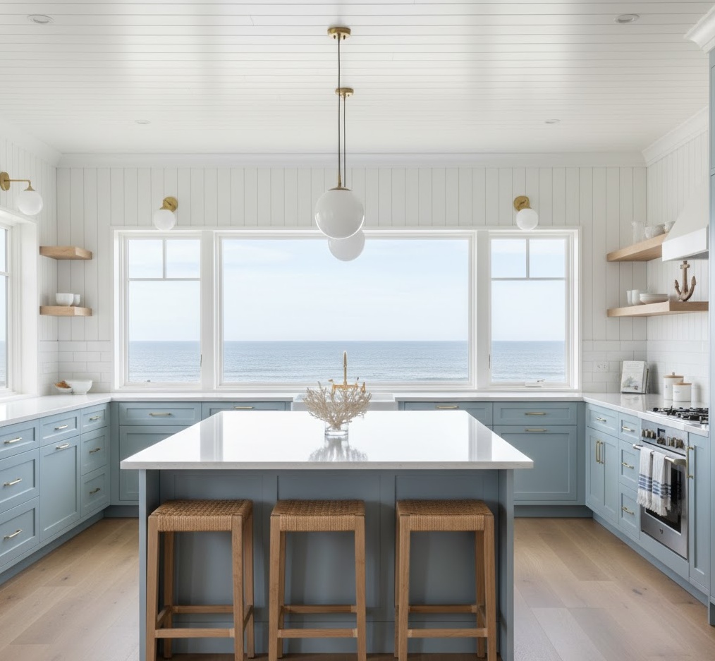 This open concept kitchen remodel brings the serene beauty of the seaside indoors, creating a light, airy, and relaxed atmosphere. It typically features a palette of whites, blues, and sandy neutrals, reminiscent of beach landscapes. Materials often include light-coloured wood, woven textures, and natural stone or quartz countertops. Shiplap panelling, glass-front cabinets, and nautical accents can further enhance the coastal vibe. The design prioritises natural light and an uncluttered feel, ensuring a seamless flow between cooking and living areas, perfect for a home seeking a refreshing and tranquil open concept kitchen.