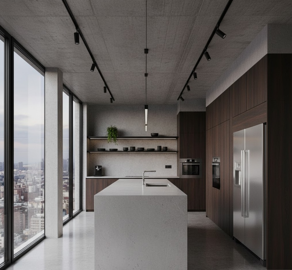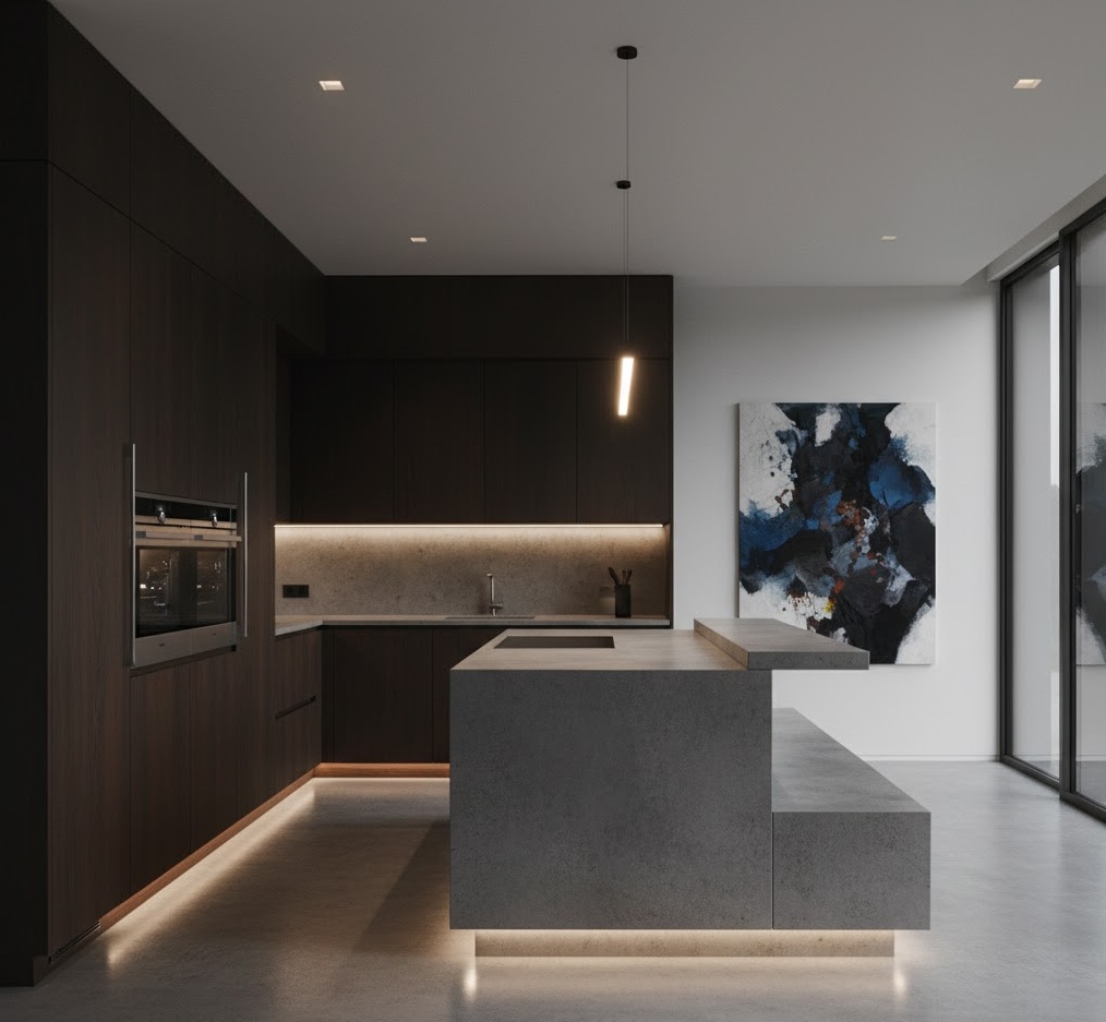 This open concept kitchen remodel is tailored for city living, blending industrial chic with modern sophistication in a compact yet stylish footprint. It often features exposed structural elements like pipes or ductwork, combined with sleek, space-saving cabinetry and integrated appliances. Materials such as concrete, stainless steel, and dark wood are prevalent, creating a sophisticated urban aesthetic. The colour scheme typically leans towards greys, blacks, and whites, with occasional bold accents. This design maximises functionality and flow in smaller spaces, making it an ideal open concept kitchen solution for a dynamic city apartment or loft.