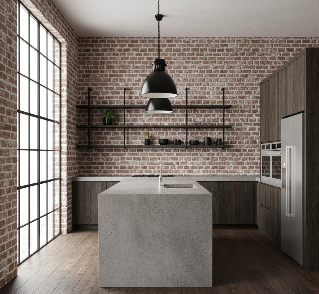An industrial open concept kitchen remodel celebrates raw, utilitarian aesthetics, blending robust materials with an urban edge. Exposed brickwork, concrete countertops, and metal accents like stainless steel or black iron are hallmarks of this style. The colour scheme typically revolves around greys, blacks, and earthy tones, often punctuated by warm wood elements to soften the look. Functionality is key, with professional-grade appliances and open shelving showcasing cookware. This design fosters a dynamic and edgy atmosphere, perfect for a loft apartment or a modern home seeking a distinctive, no-nonsense culinary hub that seamlessly connects to living spaces.
