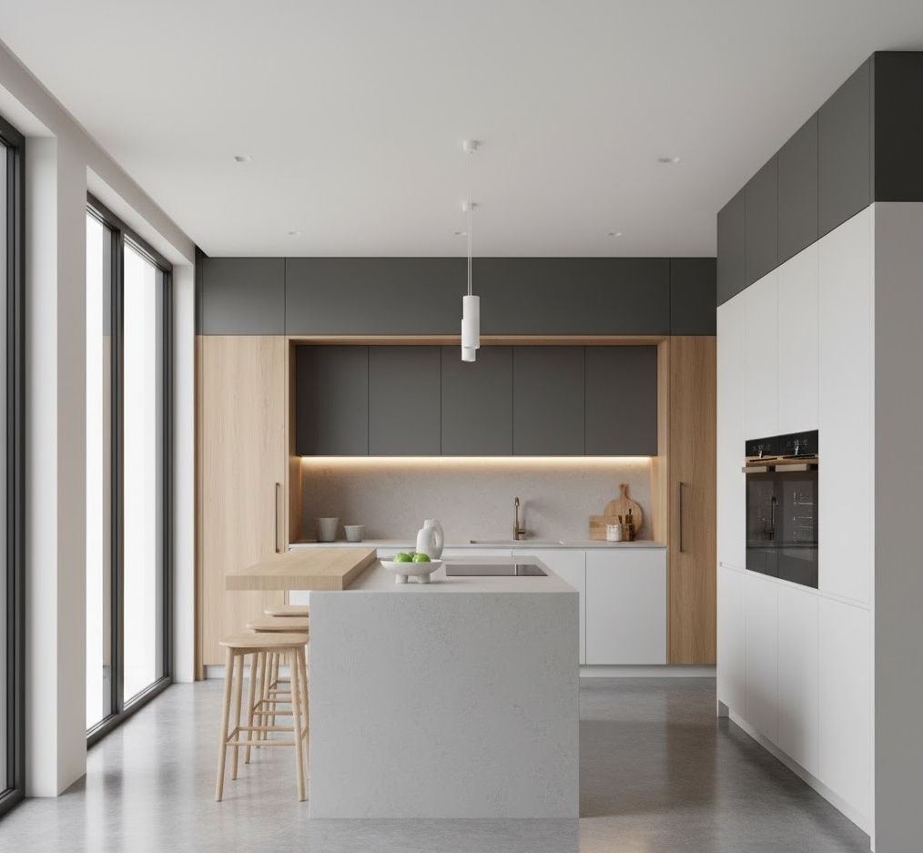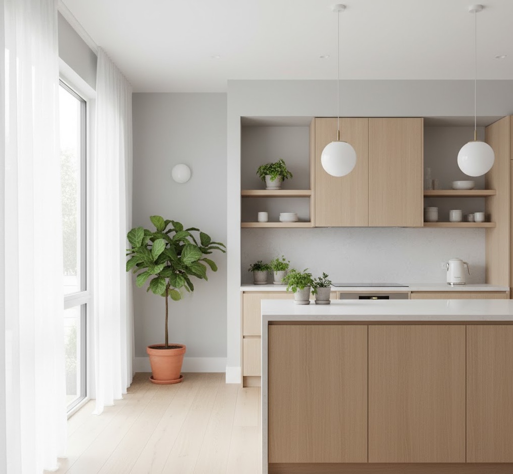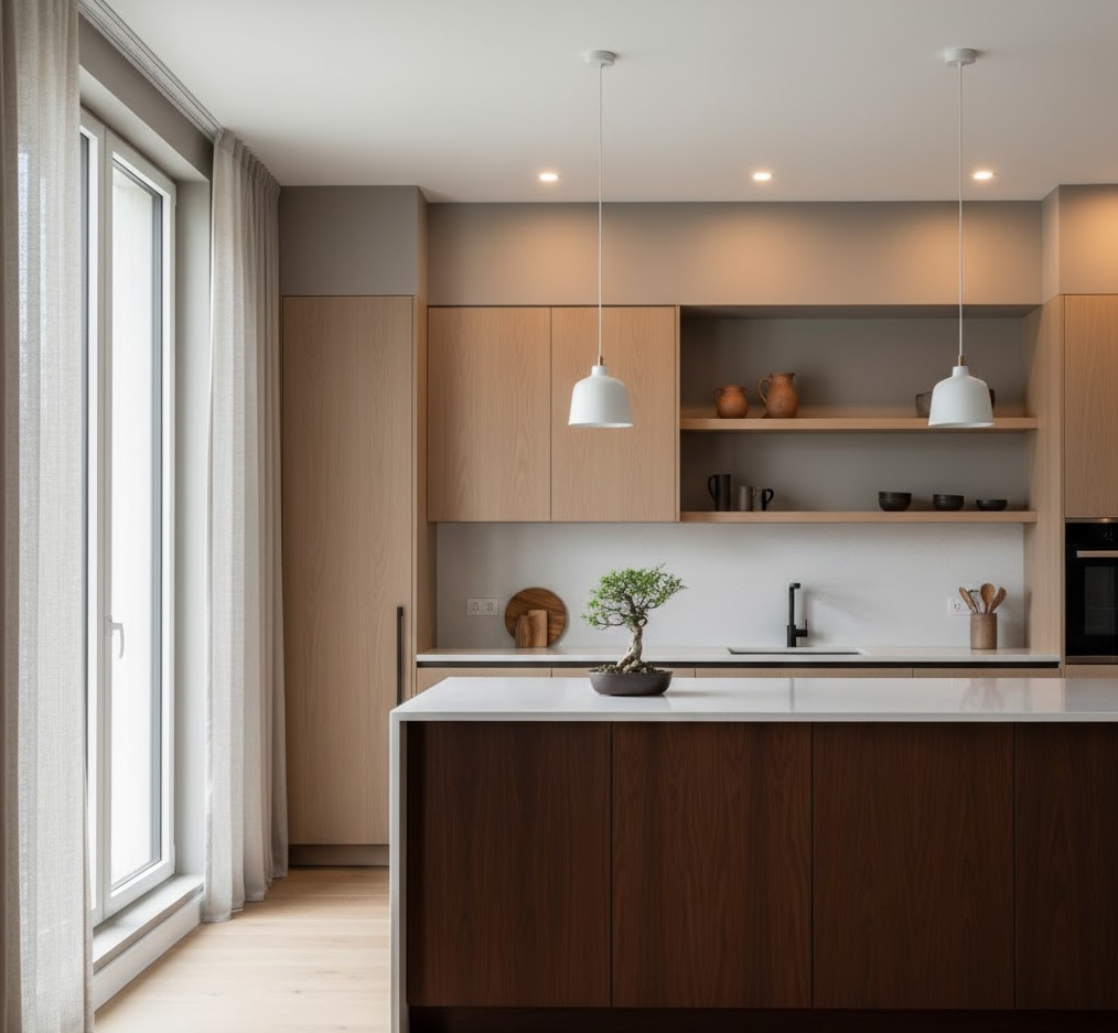 A Japandi open concept kitchen remodel harmoniously fuses Japanese minimalism with Scandinavian warmth, resulting in a serene and highly functional space. It is characterised by clean lines, natural materials, and a muted colour palette of whites, greys, and earthy tones, often with black accents. Light woods like birch or ash are combined with darker, more refined woods, and tactile textures such as linen or ceramic. The emphasis is on craftsmanship, simplicity, and creating a calm, uncluttered environment that promotes well-being. This design ensures a seamless and tranquil flow between cooking and living areas.