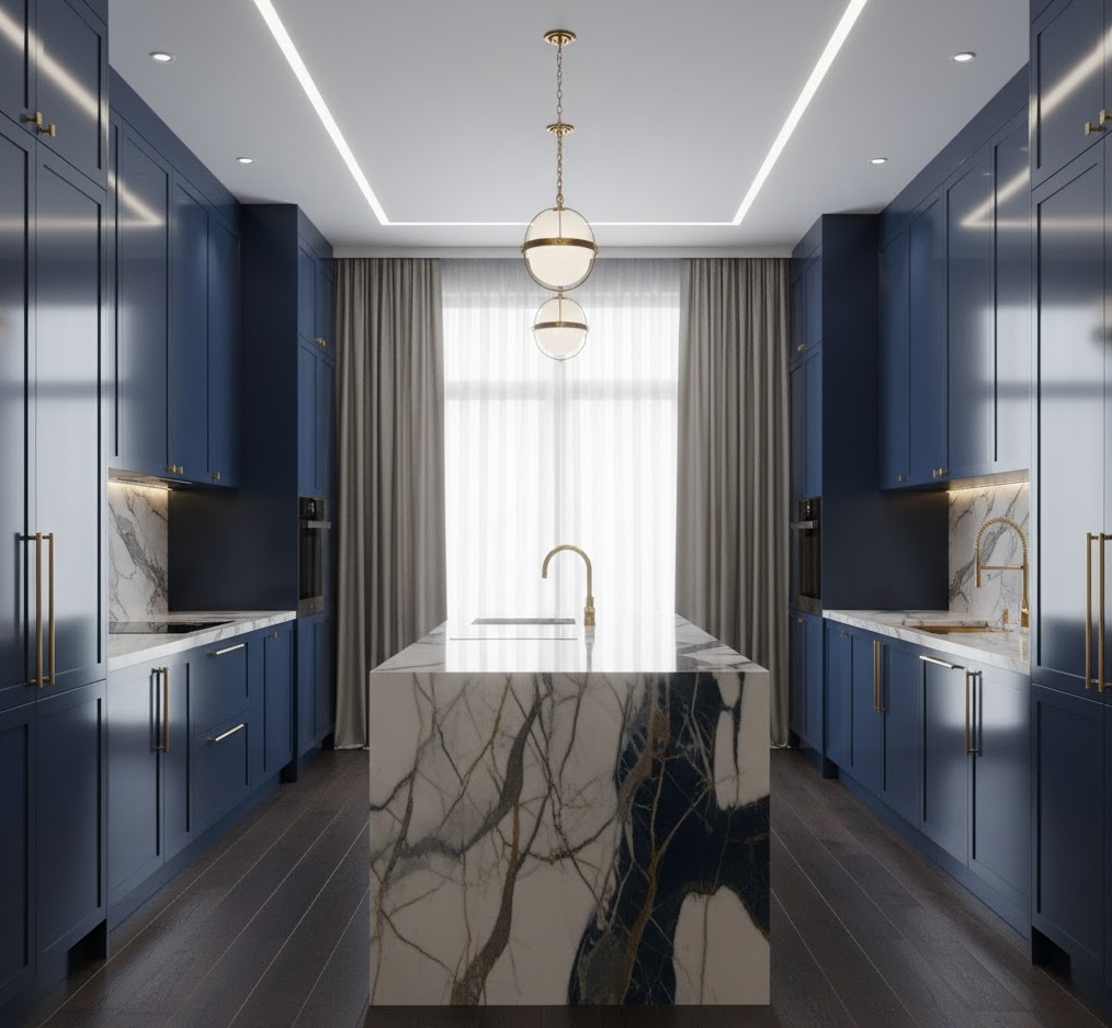 A luxe open concept kitchen remodel is all about opulence, high-end finishes, and sophisticated design, creating a truly lavish culinary experience. It features premium materials such as exotic marbles, high-gloss lacquers, polished metals like gold or brass, and custom cabinetry. The colour palette often includes deep, rich tones like navy, emerald, or charcoal, accented with metallics and crisp whites. Integrated smart appliances and bespoke lighting further enhance the luxurious feel. This design transforms the kitchen into a show-stopping centrepiece, seamlessly connecting to elegant living areas for ultimate entertaining.