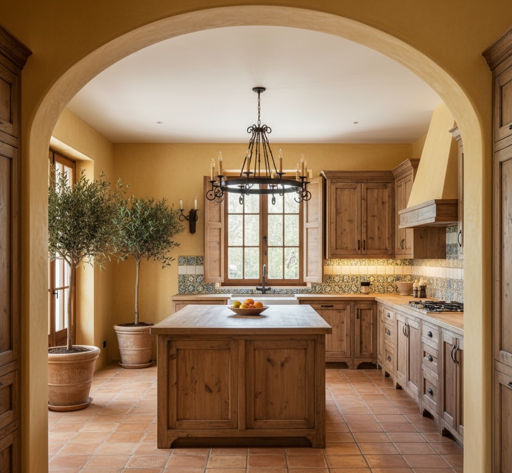 A Mediterranean open concept kitchen remodel evokes the sun-drenched charm of coastal Europe, featuring warm colours, natural textures, and rustic elegance. Terracotta tiles, wrought iron accents, and distressed wood cabinetry are common elements. The colour palette typically includes warm yellows, deep blues, olive greens, and earthy reds, creating a vibrant and inviting atmosphere. Arched doorways, decorative tilework, and exposed wooden beams often enhance the authentic feel. This design promotes a relaxed and communal cooking and dining experience, seamlessly connecting the kitchen to living areas with a holiday-like ambience.