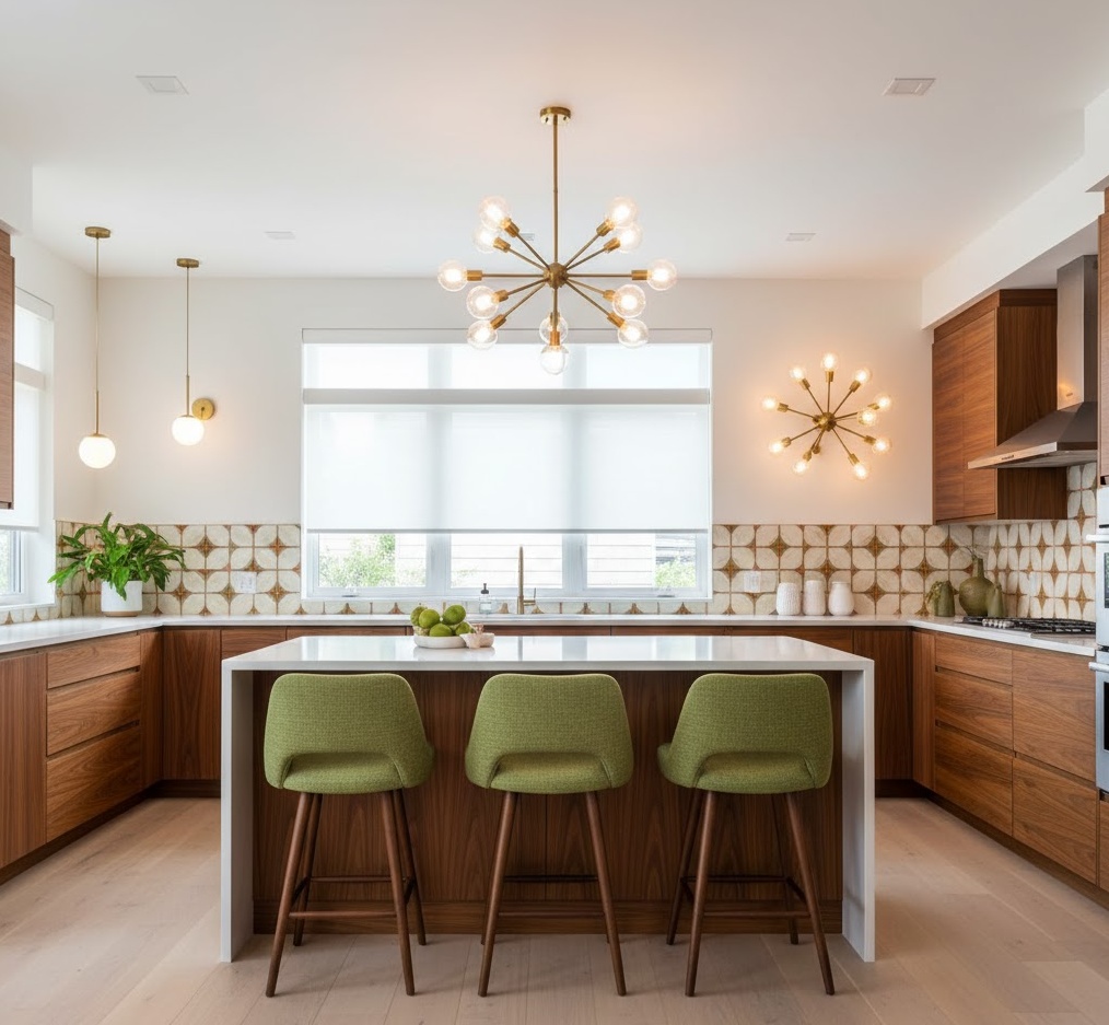 A Mid-Century open concept kitchen remodel captures the iconic style of the 1950s and 60s, blending organic shapes with functional design. It features clean lines, often with tapered legs on furniture, and a mix of natural wood tones with pops of vibrant colour. Teak, walnut, and oak are popular wood choices, complemented by laminate countertops and geometric tilework. The colour palette typically includes avocado green, mustard yellow, orange, and turquoise, alongside neutrals. This design creates a nostalgic yet timeless atmosphere, ensuring a stylish and inviting open concept kitchen that seamlessly integrates with living spaces.