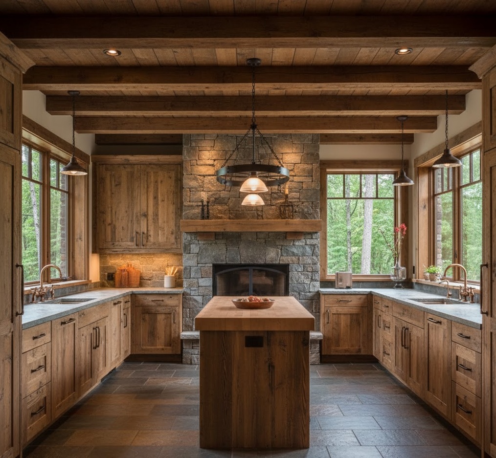 A rustic open concept kitchen remodel celebrates natural beauty and rugged charm, creating a warm and inviting atmosphere. It heavily features raw, unrefined materials such as exposed wooden beams, natural stone, and distressed wood cabinetry. The colour palette typically includes earthy tones, deep greens, and warm browns, enhancing the connection to nature. A large, sturdy island often serves as the heart of the space, promoting gathering and functionality. This design evokes a sense of history and comfort, seamlessly integrating the culinary area with living spaces for a truly homely and authentic feel.