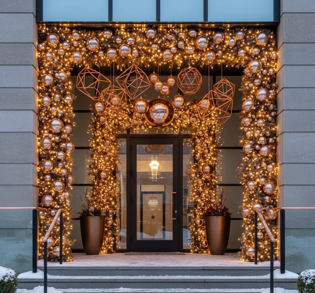 For an ultra-glamorous and contemporary statement, opt for luxe metallic outdoor decorations. This style showcases a sophisticated palette of mixed metals – think rose gold, copper, bronze, and gunmetal grey – often with high-shine or brushed finishes. Materials include large metallic spheres, geometric metal sculptures, reflective surfaces, and warm-toned LED lights. The mood is modern, opulent, and incredibly chic, creating a high-end festive display. Functionality focuses on creating visual interest through varied metallic textures and strategic lighting that highlights the reflective qualities, transforming your outdoor space into a dazzling, contemporary art installation.