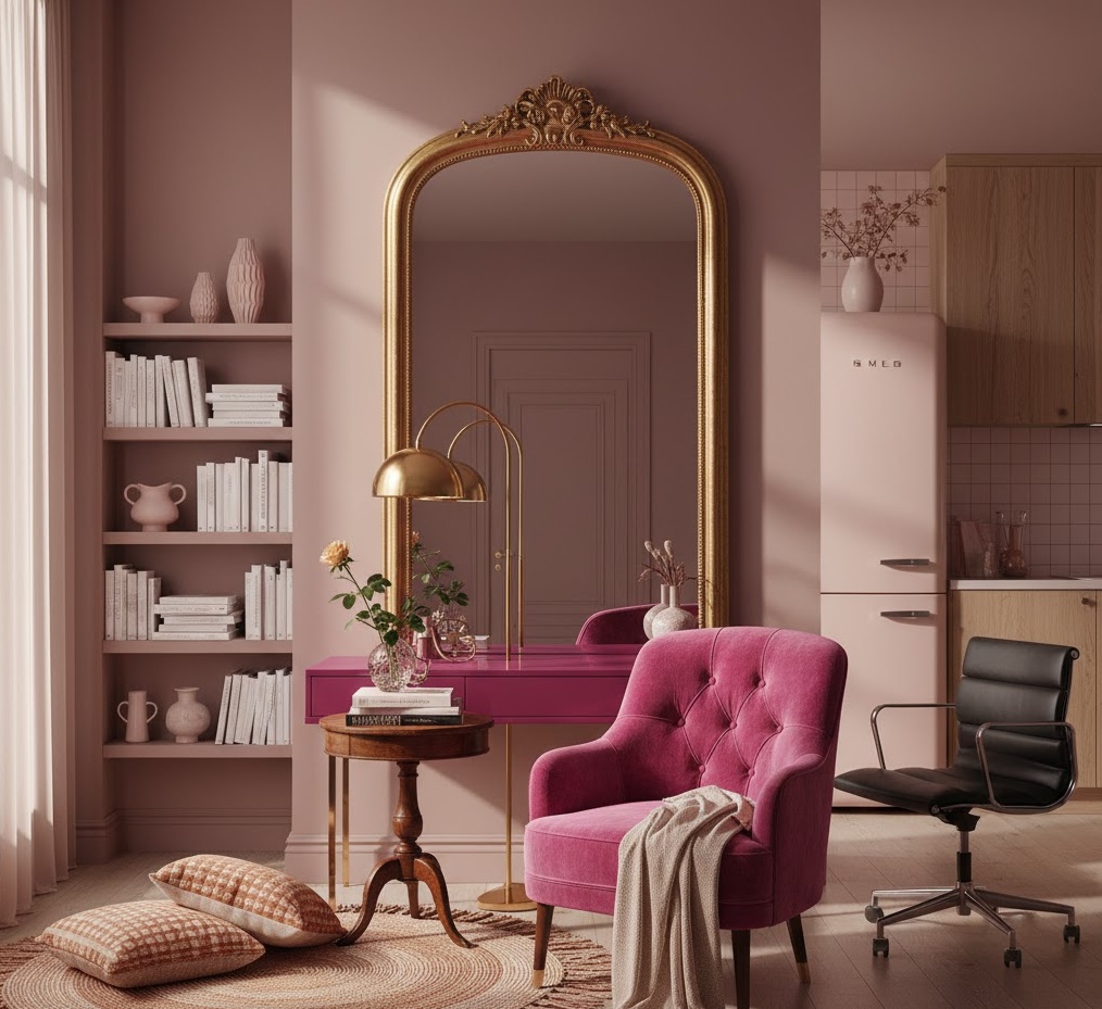 A magenta pink home office exudes bold creativity and sophisticated flair, perfect for inspiring innovative and impactful work. This deep, rich, and vibrant pink, often paired with dark wood, metallic accents, and minimalist white elements, creates a powerful and stylish workspace that commands attention. Materials such as lacquered wood surfaces, polished brass details, and luxurious leather upholstery contribute to an executive yet artistic feel, blending professionalism with personality. Functionally, the room is meticulously optimised for productivity, featuring a streamlined desk, an ergonomic chair, and smart storage solutions, all while maintaining a visually striking presence. The confident and inspiring mood of magenta pink encourages focused work and imaginative thinking, making it an exceptional choice for a truly impactful and distinctive home office.