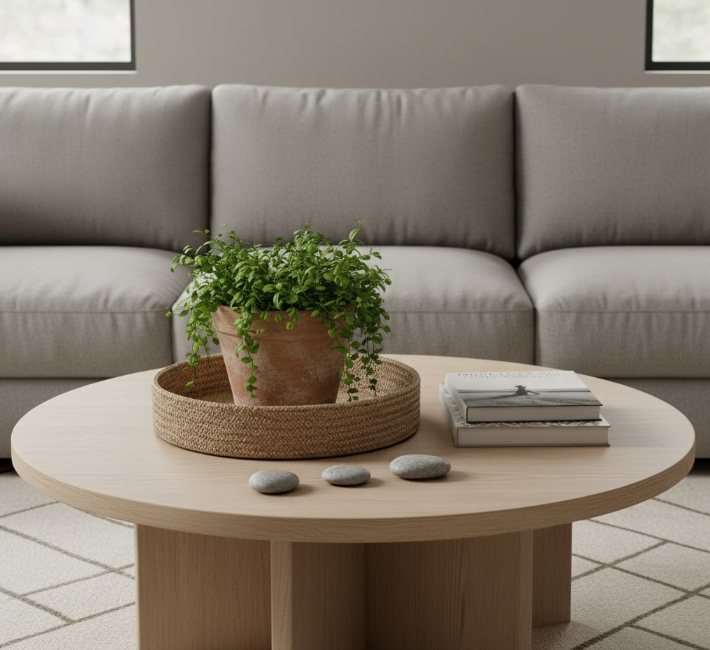 Zen inspired table styling cultivates an atmosphere of serenity, balance, and natural harmony, drawing on principles of simplicity and mindfulness. This approach typically features a round coffee table made from natural, light-toned wood or a smooth, unpolished stone, promoting a connection to the earth. Accessories are chosen for their calming presence and organic forms, such as smooth river stones, a small bamboo plant in a minimalist pot, a delicate water feature, or a single, perfectly placed candle. The colour palette is incredibly soothing, dominated by soft greens, muted greys, and natural wood tones, creating a tranquil and contemplative mood. Functionality is subtle, with items encouraging relaxation and reflection, ensuring the space feels like a peaceful sanctuary. This styling transforms your round coffee table into a focal point for calm and inner peace, inviting quiet contemplation.