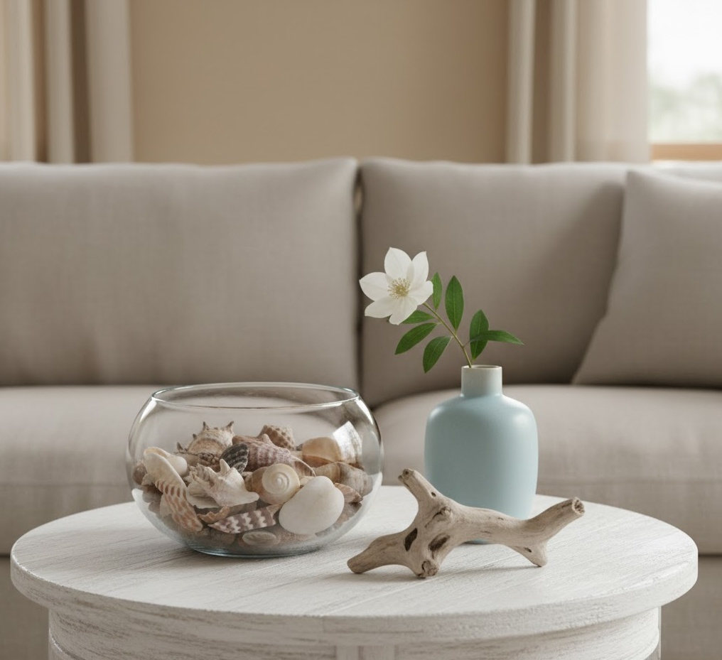 Coastal coffee table vibes evoke the serene and refreshing atmosphere of the seaside, bringing a sense of calm and lightness into your living space. This styling typically features a round coffee table in bleached wood or white-washed finishes, mirroring driftwood found on the shore. Accessories are chosen for their natural origins and soothing textures, such as a collection of smooth seashells, a piece of artfully arranged driftwood, or a glass vase filled with delicate sea glass. The colour palette is predominantly light and airy, incorporating shades of ocean blue, sandy beige, crisp white, and soft greens, creating an expansive and tranquil mood. Functionality is often subtle, with woven baskets providing discreet storage for blankets or magazines, ensuring the space remains uncluttered and effortlessly inviting. This styling transforms your round coffee table into a peaceful retreat, reminiscent of a breezy beach house.