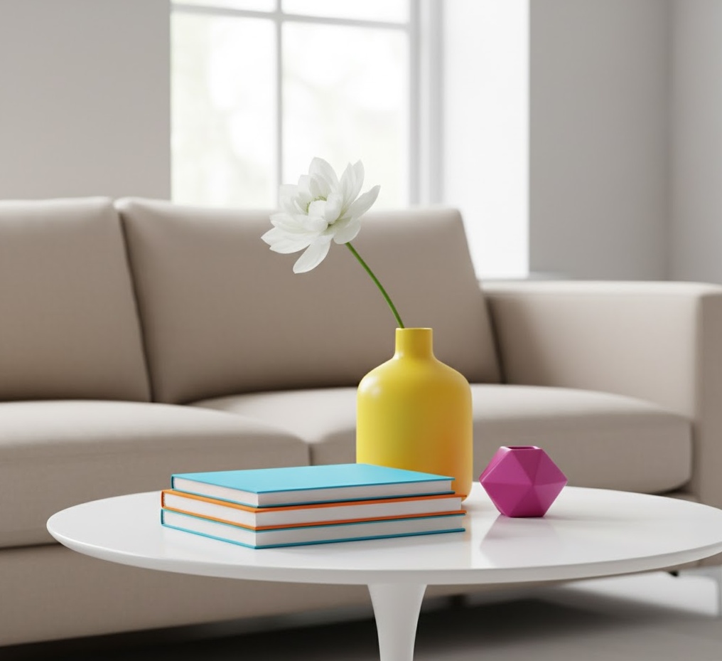 Colour pop coffee table styling injects vibrant energy and playful personality into your living space, using bold accents against a neutral backdrop. This approach typically features a round coffee table in a simple, understated material like white lacquer, light wood, or glass, providing a clean canvas for the colourful elements. Accessories are chosen for their striking hues and ability to create visual excitement, such as a bright yellow ceramic vase, a stack of books with neon spines, a turquoise decorative bowl, or a fuchsia-coloured coaster. The colour palette is predominantly neutral for the larger elements, allowing the carefully selected “pops” of colour to truly stand out and create a cheerful, modern mood. Functionality is about bringing joy and visual interest, with each item contributing to a lively and inviting atmosphere that feels fresh and contemporary. This styling transforms your round coffee table into a vibrant focal point of cheerful design.