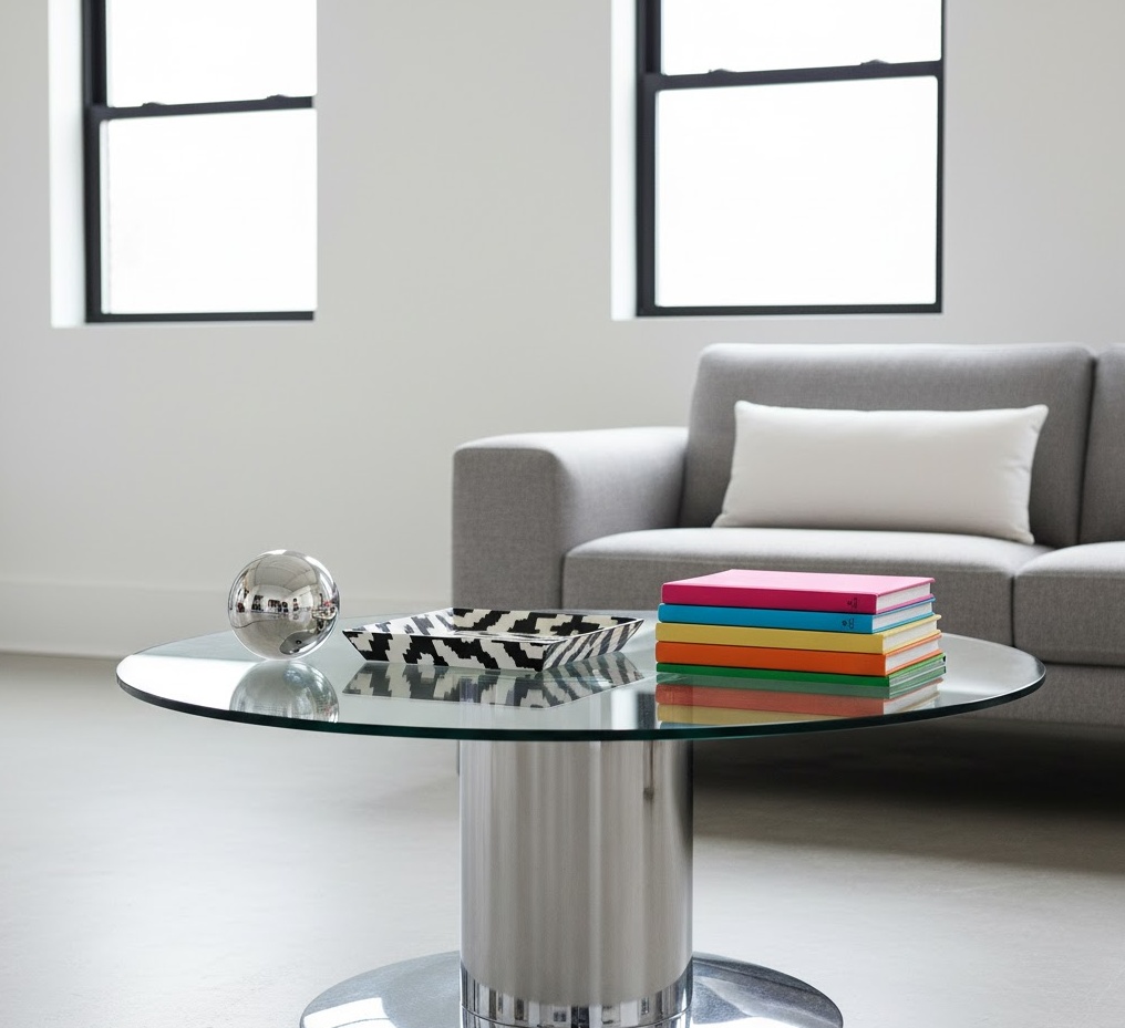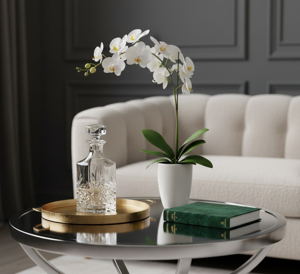 Modern glamour coffee table styling exudes sophistication and luxury, incorporating reflective surfaces, metallic accents, and rich textures to create a dazzling focal point. This look often features a round coffee table with a mirrored top, polished chrome base, or a sleek glass surface, providing an immediate sense of opulence. Accessories are chosen for their high-end appeal, such as a shimmering metallic tray, crystal decorative objects, a luxurious velvet-bound book, or a vase filled with dramatic fresh flowers like orchids. The colour palette is typically bold and refined, combining deep jewel tones like emerald green or sapphire blue with classic neutrals like black, white, and gold, creating a striking contrast. Functionality is secondary to aesthetic impact, with each item contributing to an overall mood of lavish elegance and contemporary chic. This styling transforms your round coffee table into a statement of refined taste and modern luxury.
