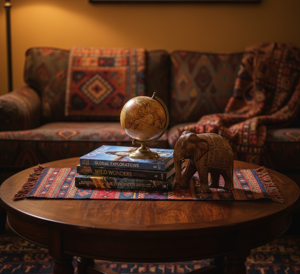 The global traveller coffee table styling tells a story of adventure and cultural exploration, showcasing cherished souvenirs and artisanal crafts from around the world. This approach often features a round coffee table made from exotic wood or a unique, handcrafted material, serving as a foundation for a collection of treasures. Accessories are chosen for their unique origins and intricate details, such as hand-carved wooden figures from Africa, vibrant textiles from India, a delicate ceramic bowl from Japan, or a vintage map. The colour palette is rich and diverse, embracing earthy tones, deep jewel colours, and intricate patterns that reflect the artistry of different cultures. Functionality is about evoking memories and sparking conversation, with each item holding a special significance, making the space feel deeply personal and inspiring. This styling transforms your round coffee table into a captivating display of worldly experiences.