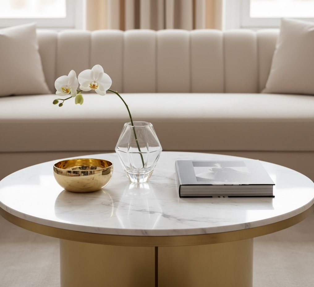 Luxurious marble table decor elevates your round coffee table to a statement of unparalleled elegance and refined taste, celebrating the timeless beauty of natural stone. This styling inherently features a round coffee table with a genuine marble top, whether pristine white Carrara, dramatic black Marquina, or veined green, immediately conveying opulence. Accessories are chosen to complement this grandeur, including polished gold or brass decorative objects, crystal glassware, a delicate silk flower arrangement, or a high-end fashion coffee table book. The colour palette is typically sophisticated, combining the natural hues of the marble with metallic accents and perhaps a single, deep jewel tone for a touch of drama. Functionality is secondary to the aesthetic impact, with each item carefully selected to enhance the luxurious mood and create a visually stunning display. This styling transforms your round coffee table into a focal point of exquisite, high-end design.