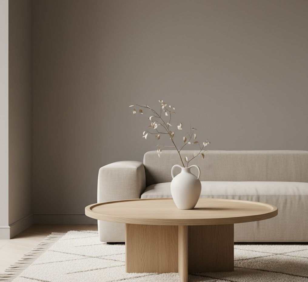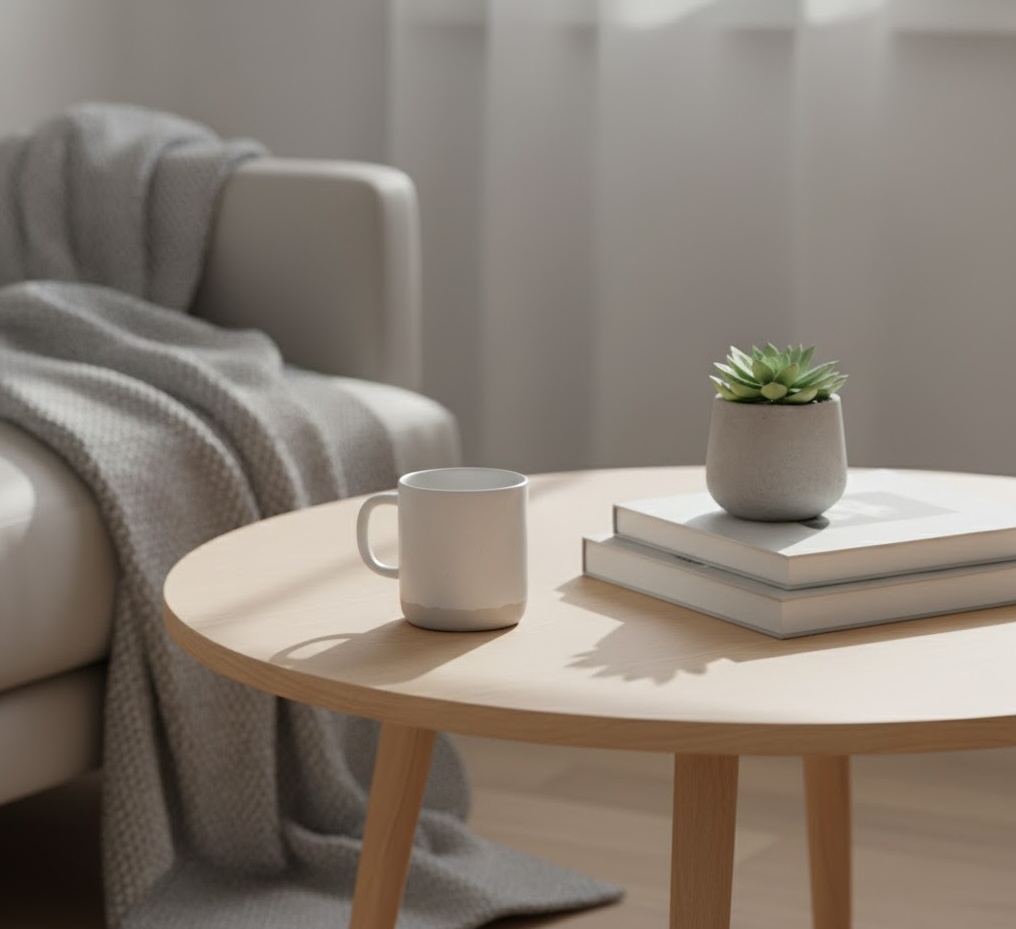 Scandinavian table elegance prioritises functionality, simplicity, and a deep connection to nature, creating a warm yet uncluttered aesthetic. This styling typically features a round coffee table made from light-coloured wood, such as birch or ash, with clean lines and a minimalist form. Accessories are carefully chosen for their understated beauty and practical purpose, including ceramic candle holders, a simple glass vase with fresh greenery, or a stack of design-focused magazines. The colour palette is dominated by muted tones – think soft greys, crisp whites, and subtle pastels – complemented by natural textures like wool, cotton, and linen, which contribute to a cosy “hygge” atmosphere. Every item on the table is thoughtfully placed, ensuring visual harmony and a sense of calm, making the space feel both inviting and highly organised. This styling transforms your round coffee table into a beacon of serene, functional beauty.