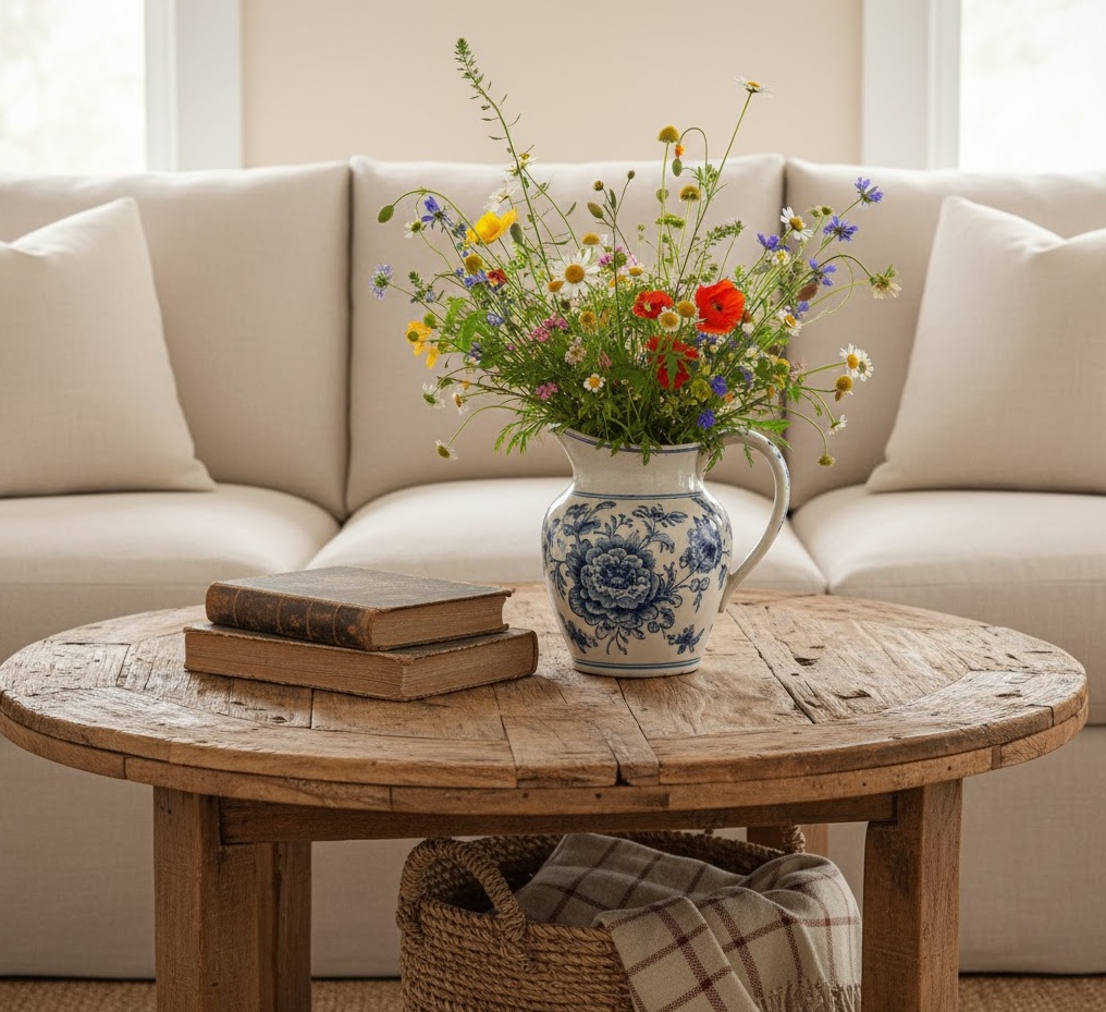 Rustic farmhouse table style brings warmth, comfort, and a touch of nostalgic charm to your living space, celebrating natural materials and a lived-in aesthetic. This look typically features a sturdy round coffee table made from distressed or reclaimed wood, showcasing its natural grain and imperfections. Accessories are chosen for their authentic, handcrafted feel, such as a vintage milk jug filled with wildflowers, a stack of antique books tied with twine, or a woven basket overflowing with cosy throws. The colour palette is warm and inviting, dominated by earthy tones like cream, sage green, and various shades of brown, often accented with classic patterns like gingham or plaid. Functionality is paramount, with items serving practical purposes while enhancing the overall homely atmosphere, making the space feel genuinely welcoming. This styling transforms your round coffee table into a comforting hub, reminiscent of a charming country home.