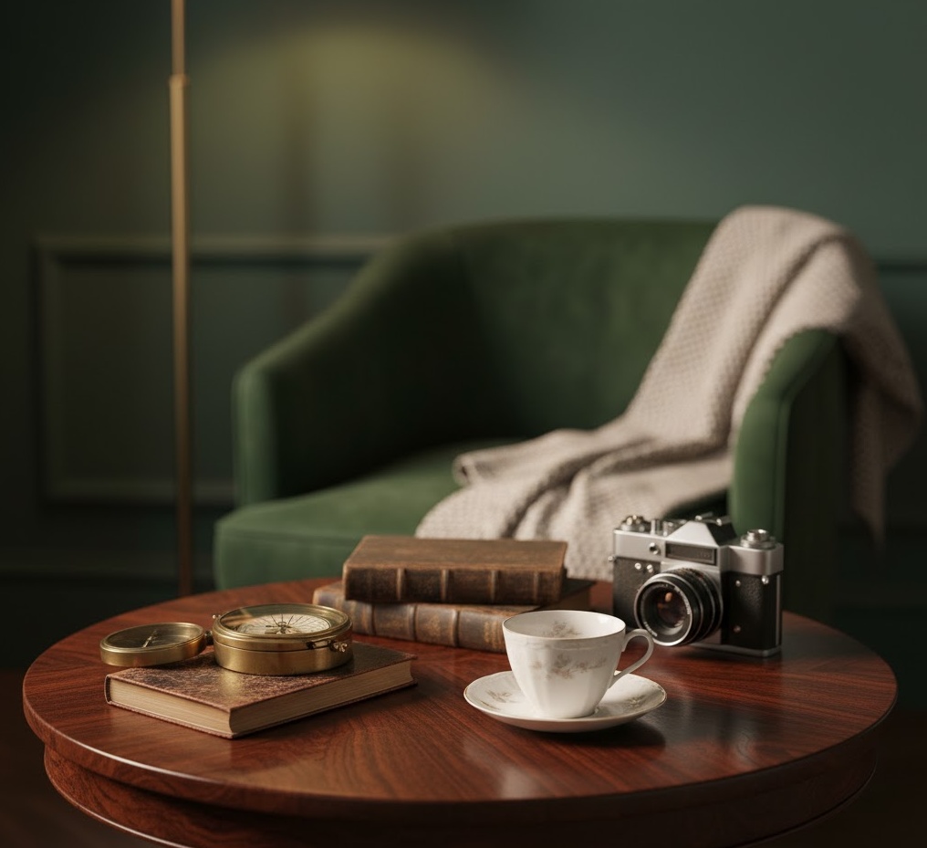 Vintage inspired coffee table styling evokes a sense of nostalgia and timeless charm, curating pieces that tell a story from bygone eras. This approach often features a round coffee table with a rich, dark wood finish or a distressed painted surface, providing an authentic foundation. Accessories are carefully sourced antique or retro finds, such as an old brass compass, a stack of leather-bound classic novels, a delicate porcelain teacup, or a vintage camera. The colour palette tends towards warm, muted tones – think sepia, deep greens, burgundy, and aged brass – creating a cosy and inviting atmosphere that feels deeply personal. Functionality is often about appreciating the craftsmanship of the past, with items chosen for their historical significance and unique character, making the space feel both comfortable and intriguing. This styling transforms your round coffee table into a captivating display of cherished memories and historical elegance.
