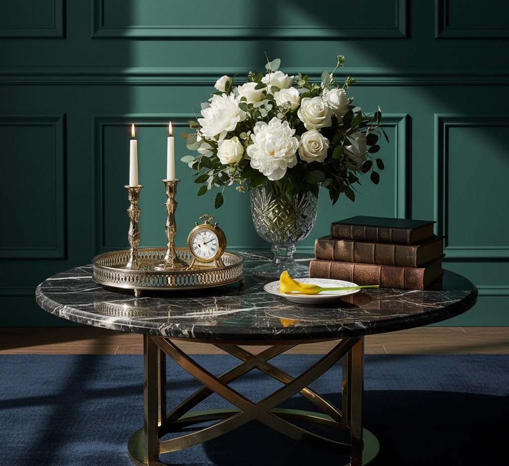 Luxurious marble coffee table styling elevates your living space with unparalleled elegance, sophistication, and a touch of timeless grandeur. This aesthetic celebrates the inherent beauty and unique veining of marble, making the table itself a primary design statement. Styling focuses on enhancing this natural opulence with high-end accessories and refined details. Materials such as polished brass, crystal, velvet, and delicate glass are ideal complements, creating a harmonious blend of textures and finishes. Elements often include a sleek metallic tray, a designer candle, a small, exquisite floral arrangement, or a stack of glossy art books. The colour palette typically features crisp whites, deep blacks, rich greys, and metallic accents, fostering an atmosphere of refined indulgence. This approach ensures your round coffee table becomes a magnificent centrepiece, embodying ultimate luxury and classic beauty.