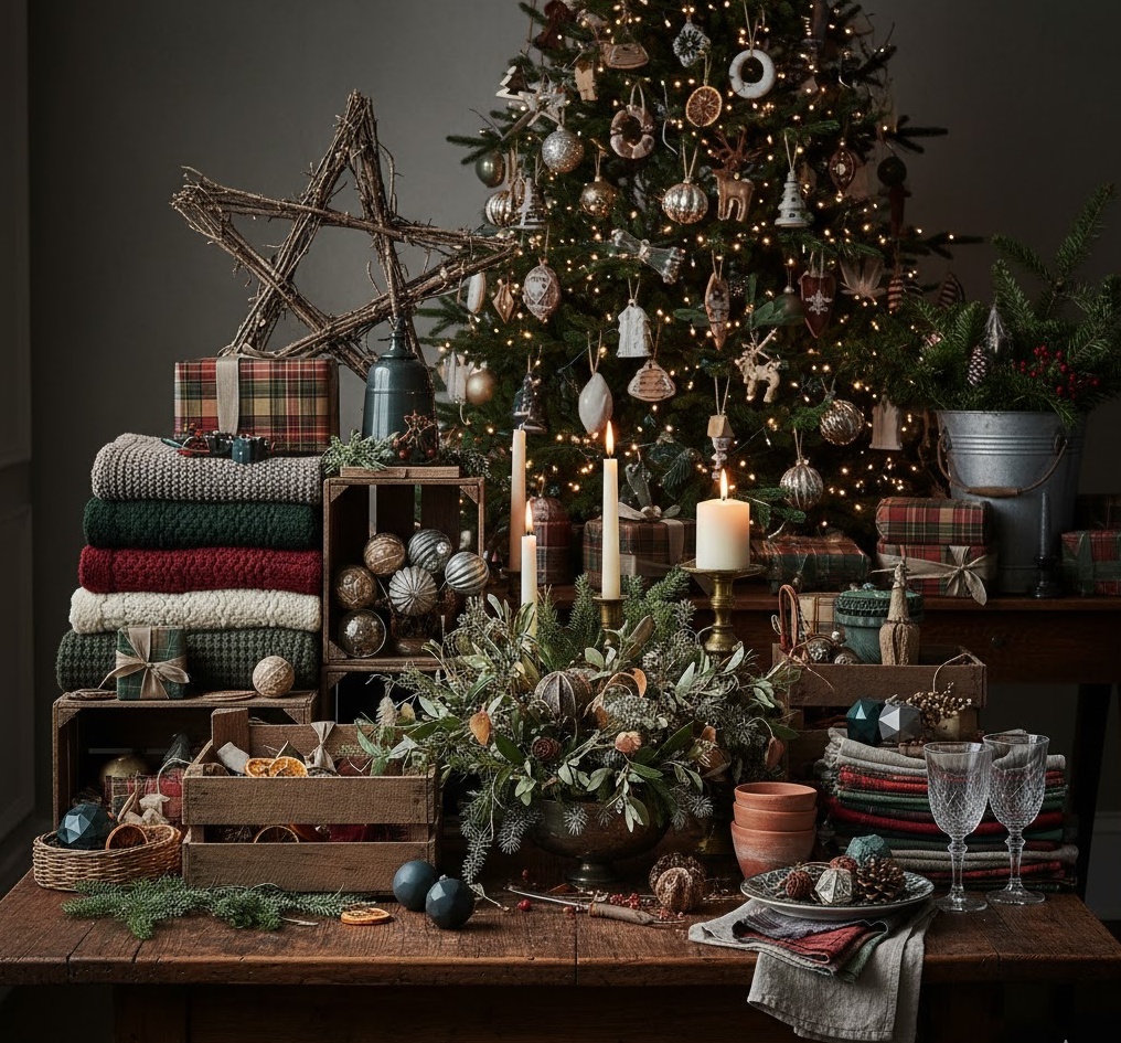 Ground your festive decor in the comforting tones of an earthy rustic Christmas palette, celebrating the rich colours of the natural world. This style features a warm and inviting array of deep terracotta, olive green, burnt orange, and warm browns, often complemented by creamy whites and natural wood. Materials like unglazed pottery, linen, jute, and rough-hewn timber are central, creating a tactile and organic environment. The mood is one of wholesome warmth and grounded serenity, perfect for a truly authentic and unpretentious holiday. Functionality is expressed through handcrafted ornaments, woven textiles, and decorations that highlight the beauty of natural dyes and textures, making your rustic Christmas feel deeply connected to the earth.