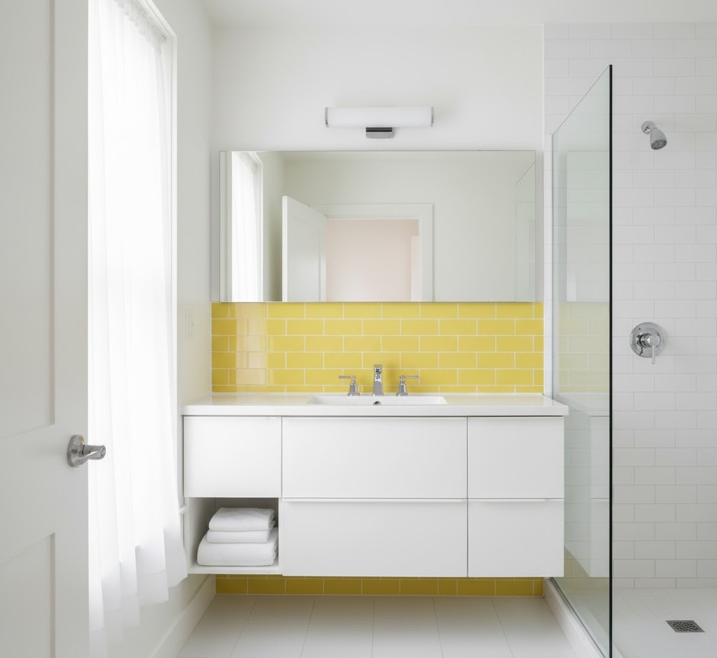 Maximise light and create an uplifting atmosphere with bright small bathroom colours, ensuring your compact space feels vibrant and expansive. Opt for brilliant whites, sunny yellows, or cheerful pastels like light aqua or pale coral, which reflect light effectively and visually push back walls. High-gloss finishes on tiles or cabinetry further enhance this effect, bouncing light around the room. Materials such as white ceramic, polished chrome, and clear glass contribute to a sparkling, clean aesthetic. The mood is one of invigorating energy and openness, transforming a small bathroom into a cheerful and inviting area. These small bathroom colour ideas are perfect for making the most of limited natural light and creating a truly luminous environment.
