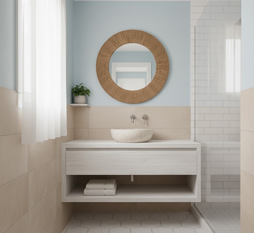 Embrace the refreshing allure of coastal small bathroom colours to transform your compact space into a tranquil seaside escape, perfect for unwinding after a long day. This delightful scheme typically features a palette of soft blues, sandy beiges, and crisp whites, reminiscent of sun-drenched beaches and gentle ocean breezes, instantly expanding the perceived size of your room. To enhance this airy aesthetic, consider incorporating natural materials such as whitewashed timber panelling, natural stone tiles, and woven rattan accents, which add texture and warmth without overwhelming the modest dimensions. Functionality remains paramount, with clever, integrated storage solutions often crafted from light-coloured wood or painted finishes, ensuring a clutter-free environment that feels both organised and serene. This carefully chosen palette not only brightens the room but also evokes a profound sense of calm and spaciousness, making your small bathroom a truly inviting and stylish retreat.