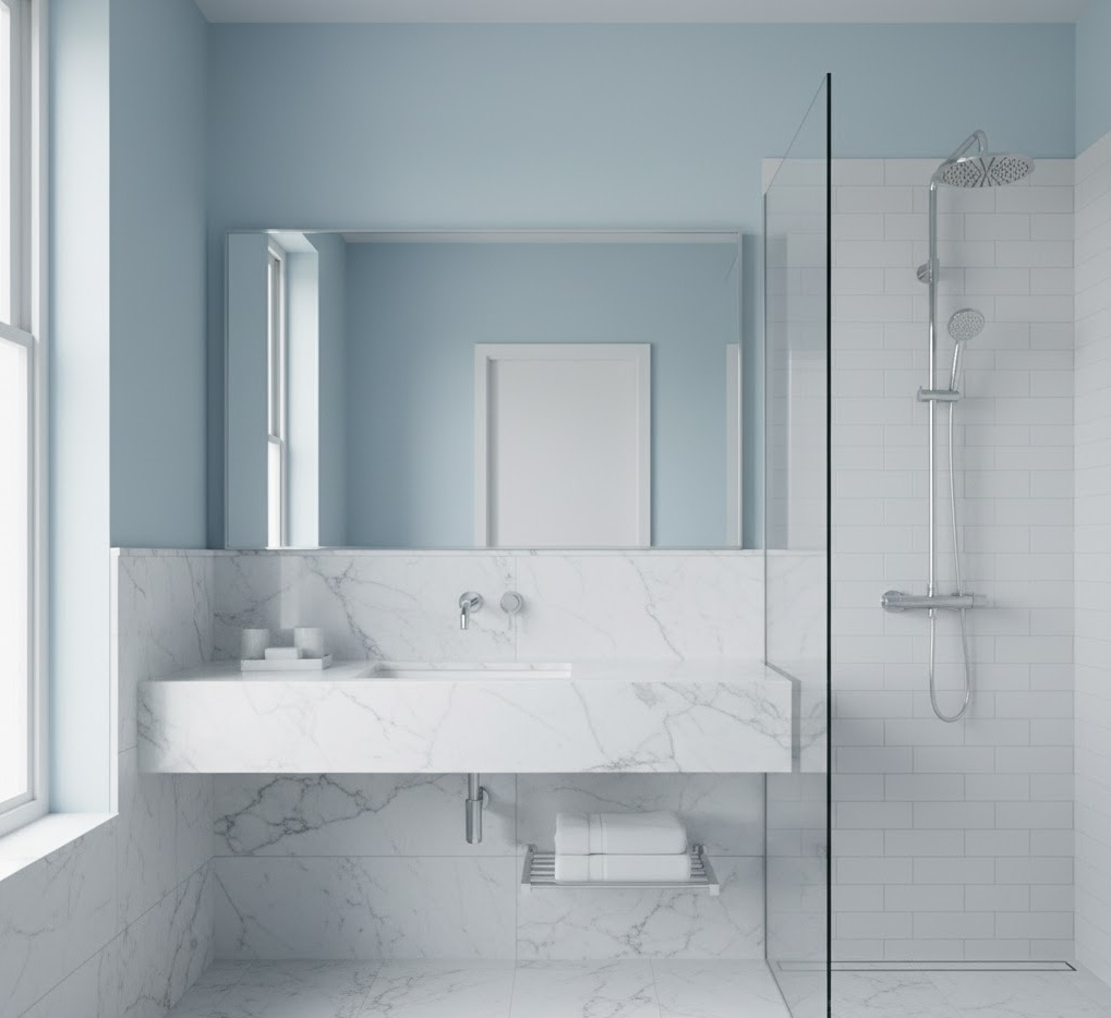 Create a tranquil oasis with serene small bathroom shades, designed to promote relaxation and calm in your compact space. Soft, muted tones like pale sage green, dusty rose, sky blue, or warm greys are ideal, as they reflect light beautifully and contribute to an open, airy atmosphere. Natural materials such as unpolished stone, smooth ceramic, and light wood add to the soothing aesthetic, providing subtle texture without visual clutter. The mood is one of gentle repose, perfect for unwinding. These small bathroom colour ideas focus on creating a harmonious environment where functionality meets understated elegance, ensuring your compact bathroom feels like a peaceful retreat rather than a cramped necessity.