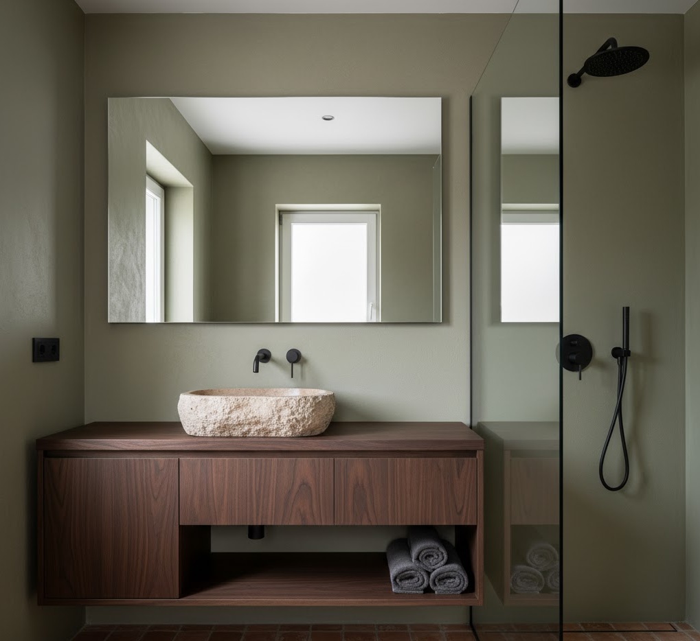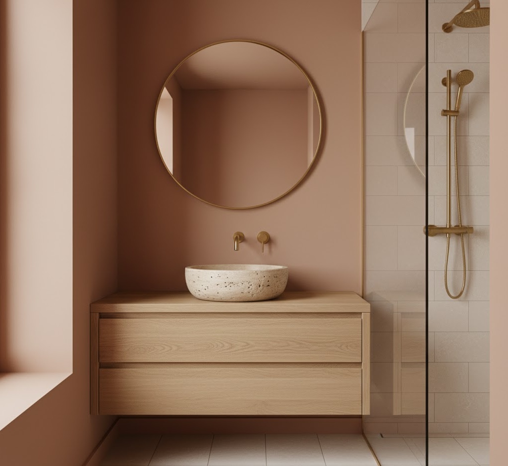 Connect with nature and create a grounded feel using earthy small bathroom palettes, bringing a sense of organic calm to your compact space. Colours such as warm beige, muted olive green, terracotta, and deep brown evoke natural landscapes, fostering a serene and inviting atmosphere. These hues pair beautifully with raw, tactile materials like unglazed ceramic tiles, natural wood, stone, and even concrete, adding depth and authenticity. The mood is one of rustic elegance and natural harmony, making the bathroom feel like a peaceful retreat. These small bathroom colour ideas are excellent for adding character and warmth, ensuring the space feels both intimate and connected to the outdoors, without feeling cramped.