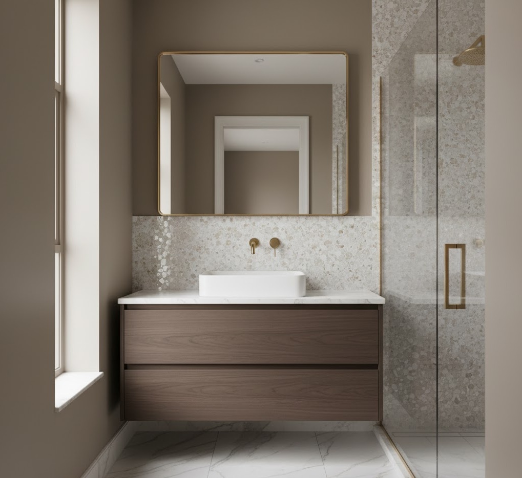 Achieve refined sophistication with elegant small bathroom ideas, transforming your compact space into a chic and polished retreat. A palette of sophisticated neutrals like champagne, taupe, charcoal, and soft gold accents creates an atmosphere of understated luxury. These colours, when combined with high-quality finishes, elevate the entire room. Materials such as polished marble, shimmering mosaic tiles, dark wood, and brushed gold or bronze fixtures add a touch of glamour. The mood is one of refined grace and timeless beauty, making the small bathroom feel exceptionally grand. These small bathroom colour ideas focus on exquisite details and a cohesive design, proving that elegance is achievable regardless of size.