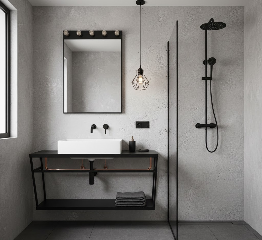 Embrace an edgy, urban aesthetic with industrial small bathroom colours, transforming your compact space into a raw yet refined sanctuary. This style typically features a palette of greys, blacks, whites, and earthy browns, often showcasing exposed elements. Think concrete walls or floor, brick effect tiles, and metallic accents like matte black or brushed steel fixtures. Materials such as reclaimed wood, exposed piping, and utilitarian lighting fixtures add to the authentic industrial charm. The mood is one of rugged sophistication and functionality, making a bold statement in a small area. These small bathroom colour ideas celebrate raw textures and honest materials, creating a unique and impactful design that feels both modern and timeless.