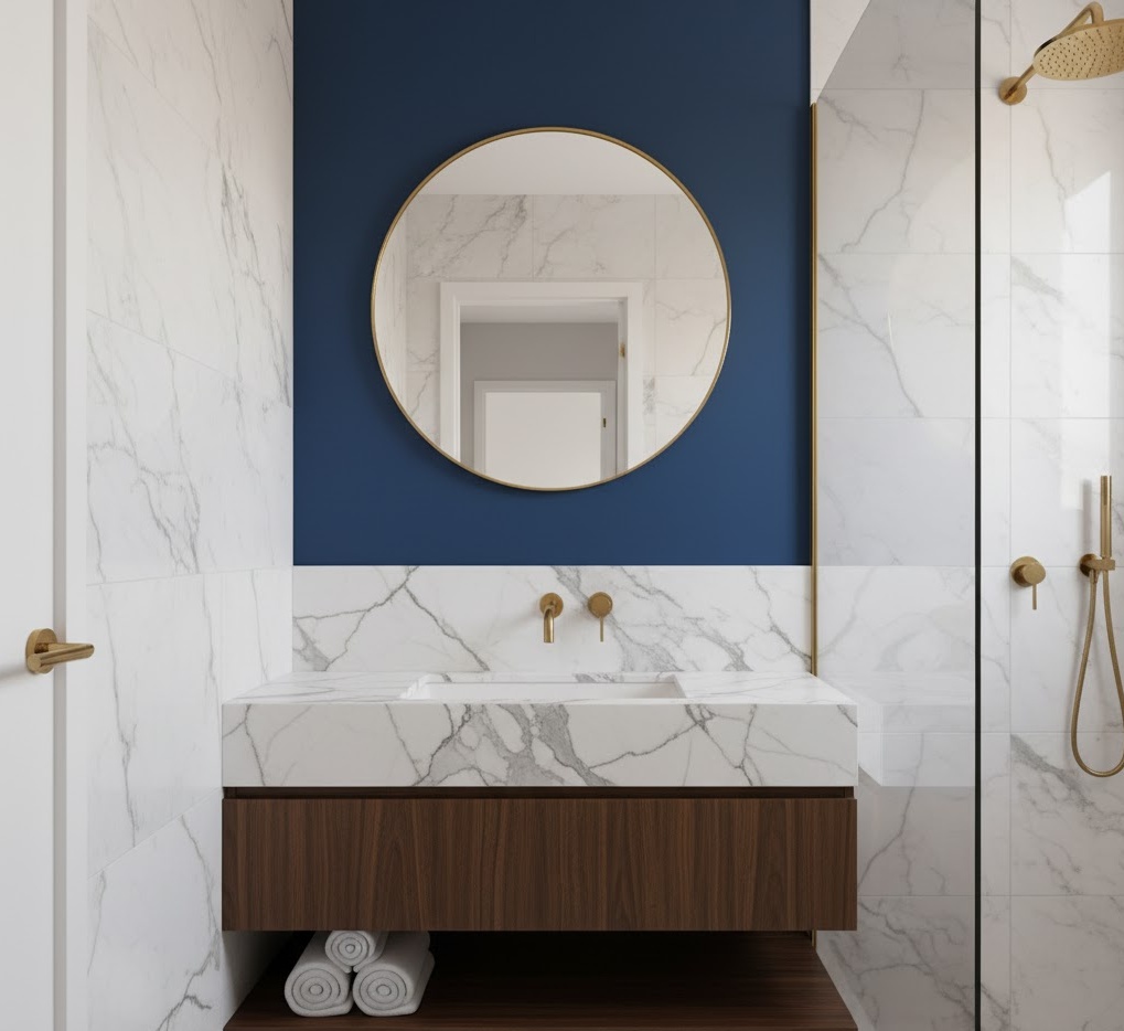Elevate your compact space with luxurious small bathroom hues, transforming it into a sophisticated and opulent sanctuary. Deep jewel tones like sapphire blue, emerald green, or rich charcoal grey, when paired with metallic accents, create an immediate sense of grandeur. Use these darker shades on an accent wall or through exquisite tiles, balancing them with lighter, reflective surfaces like marble or polished plaster to prevent the room from feeling too enclosed. Materials such as brass, gold, dark wood, and veined marble enhance the lavish aesthetic. The mood is one of indulgent elegance, proving that even small bathrooms can exude high-end style and provide a truly decadent experience.