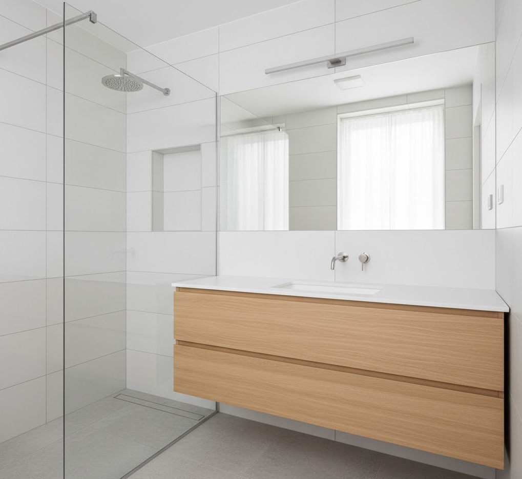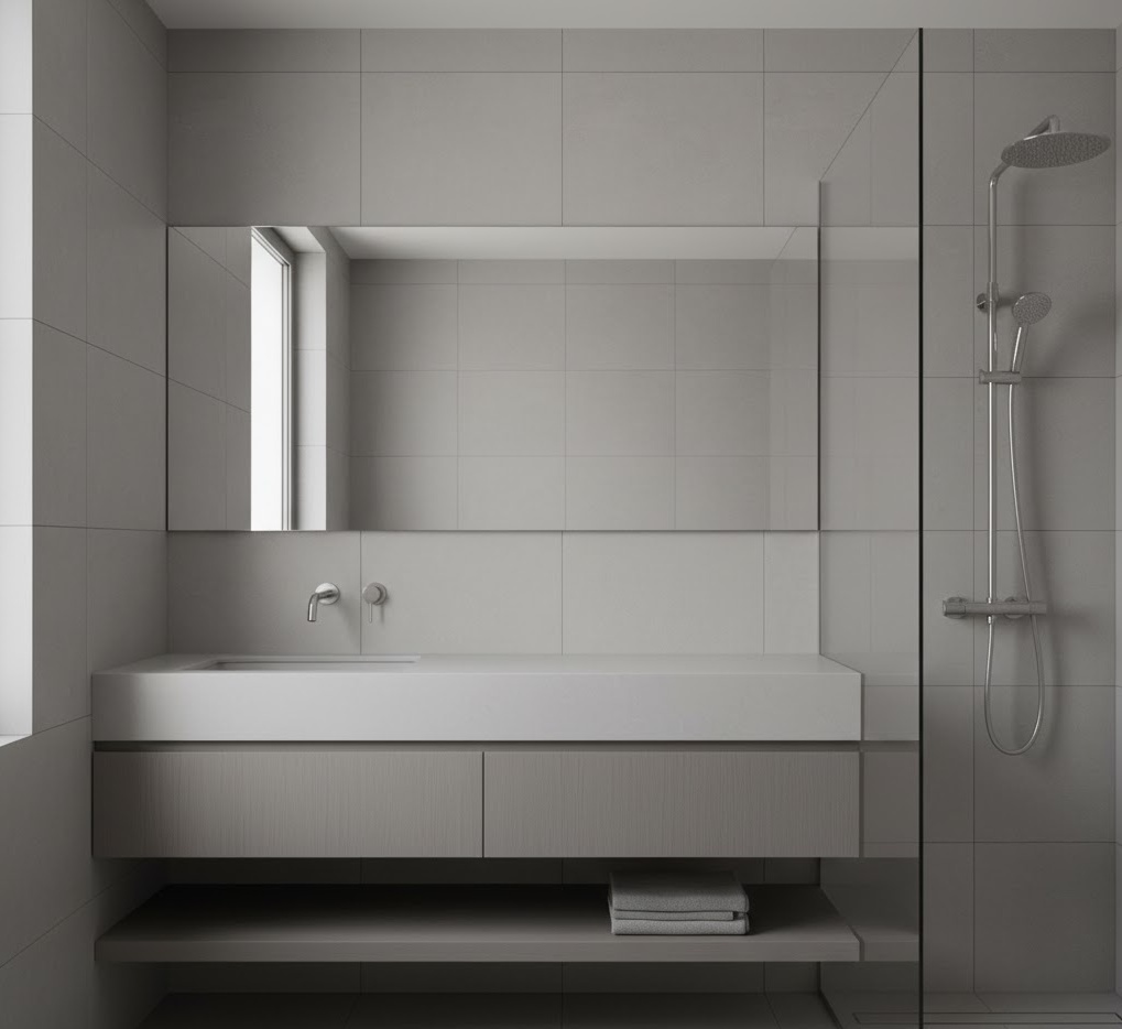 For a clean and uncluttered aesthetic, minimalist small bathroom hues are an excellent choice, focusing on simplicity and functionality. This style typically employs a restrained palette of whites, off-whites, light greys, and subtle natural wood tones, creating an expansive and airy feel essential for compact spaces. Materials are often sleek and smooth, such as large format porcelain tiles, polished concrete, and seamless solid surfaces, which minimise visual breaks and enhance the sense of continuity. The mood is one of calm efficiency, with every element serving a purpose and contributing to a serene environment. By stripping away excess, these small bathroom colour ideas ensure the space feels larger and more organised, promoting a tranquil and refreshing experience.