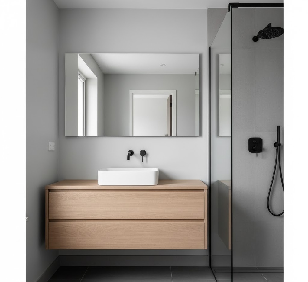 Achieve a sleek and contemporary look with modern small bathroom tones, focusing on clean lines and sophisticated simplicity. A palette of crisp whites, various shades of grey, and black accents forms the foundation, often complemented by natural wood or concrete elements for warmth. This minimalist approach ensures the compact space feels uncluttered and visually expansive. Materials typically include large format tiles, polished concrete, glass, and stainless steel, all contributing to a streamlined aesthetic. The mood is one of understated elegance and efficiency, perfect for a busy lifestyle. These small bathroom colour ideas prioritise functionality and form, creating a chic and highly practical environment that feels effortlessly stylish.