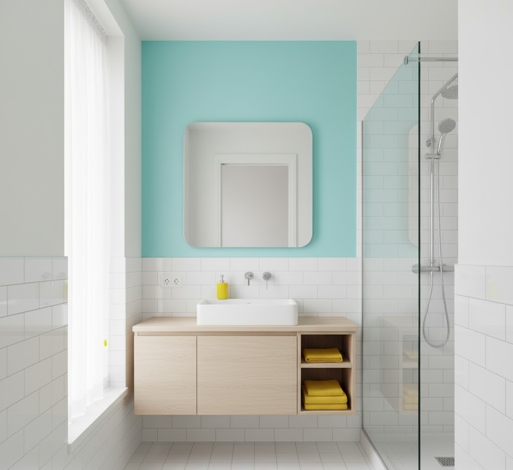 Inject personality and fun into your compact space with playful small bathroom shades, creating an energetic and cheerful environment. Bright, unexpected colours like coral, turquoise, lemon yellow, or even a mix of pastels can be used on an accent wall, through colourful tiles, or with vibrant accessories. Balance these lively hues with crisp whites or light neutrals to maintain an open feel and prevent overwhelming the small area. Materials such as glossy ceramic tiles, colourful mosaics, and quirky patterned wallpapers contribute to the whimsical aesthetic. The mood is one of joyful exuberance, transforming a functional space into a delightful surprise. These small bathroom colour ideas are perfect for those who dare to be different.