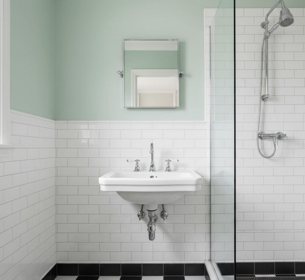 Step back in time with charming vintage small bathroom shades, imbuing your compact space with character and nostalgic appeal. Soft pastels like mint green, pale yellow, or powder blue, combined with classic black and white, are quintessential to this style. Think of traditional subway tiles, checkerboard floors, and clawfoot tubs (if space allows), or simply vintage-inspired fixtures. Materials such as ceramic, porcelain, and chrome are key, often featuring intricate details or classic patterns. The mood is one of timeless elegance and quaint charm, making the small bathroom feel unique and inviting. These small bathroom colour ideas celebrate heritage design, creating a space that feels both personal and enduringly stylish.