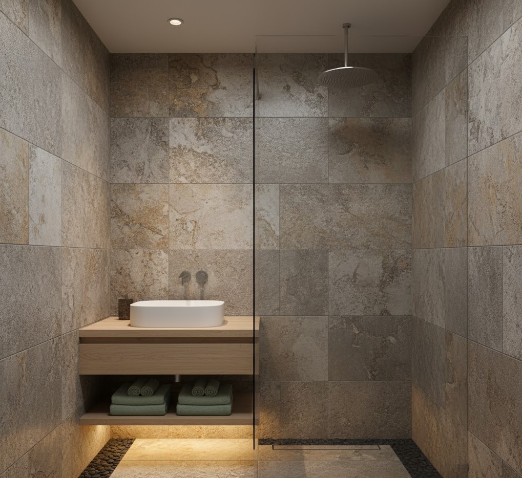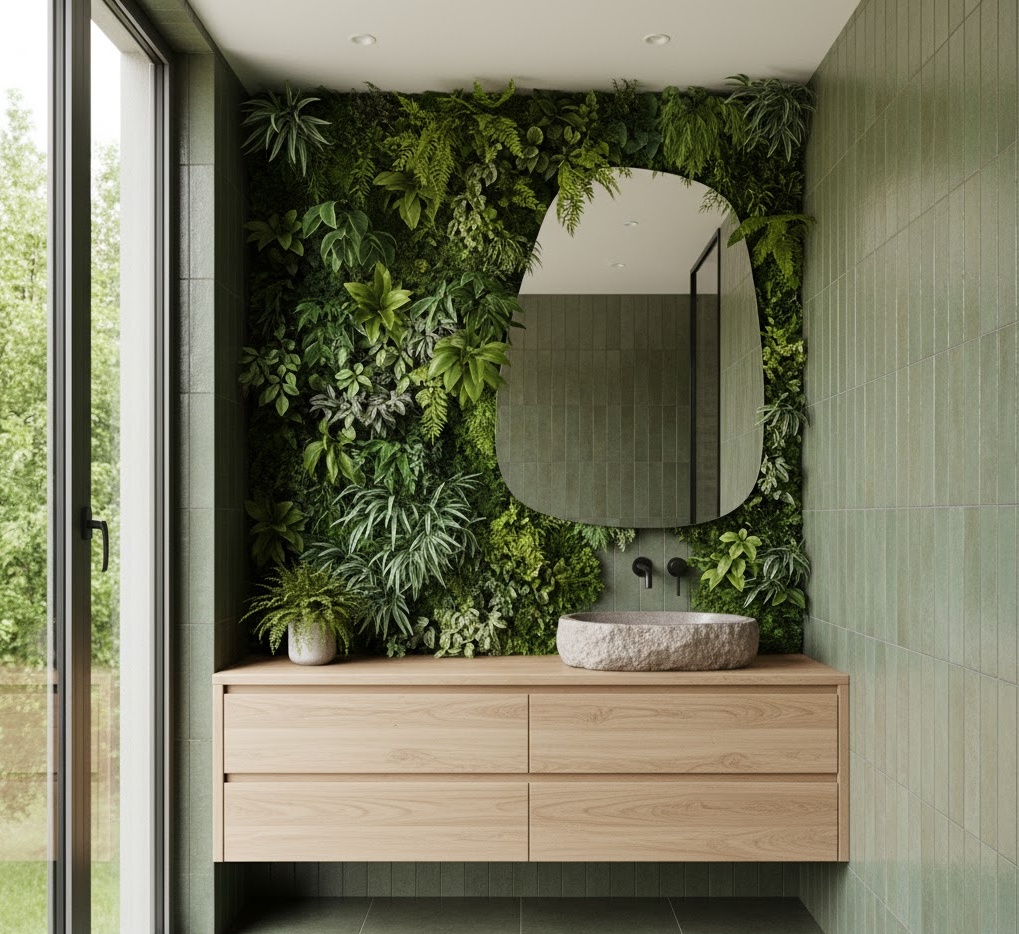 Connect with nature in your compact space through biophilic small bathroom design, bringing the outdoors in. This style focuses on incorporating natural elements, light, and views to enhance well-being and create a refreshing atmosphere. A palette of greens, earthy browns, and natural whites is dominant, reflecting the colours of the natural world. Materials like natural wood, stone, living plants, and plant-inspired patterns are essential. Functionality is achieved through clever placement of plants, natural light maximisation, and organic-shaped fixtures. The mood is calming, invigorating, and deeply connected to nature, making a small bathroom feel like a breath of fresh air.