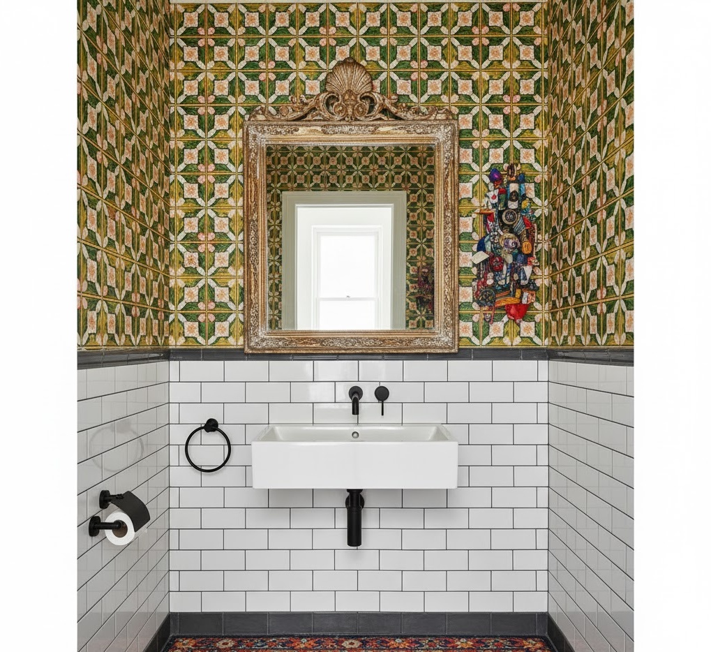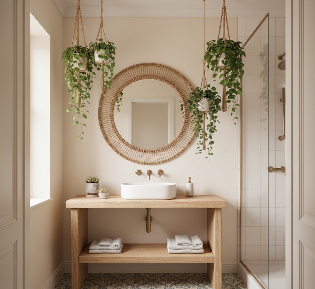 Infuse your tiny bathroom with free-spirited charm using boho chic small bathroom decorating ideas. This style is all about layering textures, patterns, and natural elements to create a warm, inviting, and eclectic space. A base of neutral colours like white, cream, or earthy tones is often accented with pops of vibrant colour through textiles and accessories. Materials such as rattan, macramé, woven baskets, and natural wood are essential, alongside patterned tiles or wallpaper. Functionality is achieved through creative storage and a relaxed approach to organisation, making the space feel lived-in and personal. The mood is relaxed, artistic, and wonderfully unique.