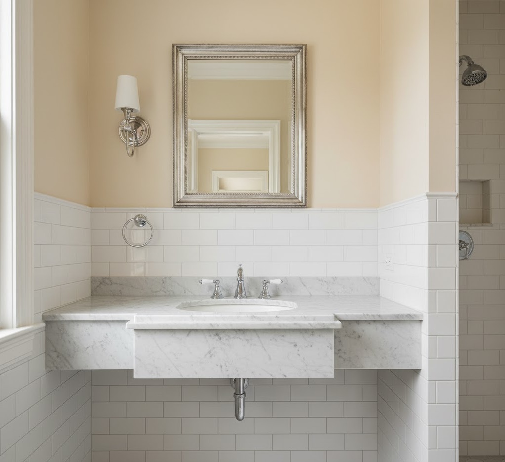 Create a timeless and sophisticated retreat with classic elegant small bathroom decorating ideas. This style focuses on refined details, luxurious materials, and a sense of enduring beauty. A palette of soft neutrals like cream, beige, and pale grey is often complemented by rich accent colours such as deep navy or emerald green. Marble, polished chrome, brass, and traditional ceramic tiles are key materials, lending an air of opulence. Functionality is seamlessly integrated with bespoke cabinetry and classic fixtures that enhance the room’s grandeur. The mood is one of understated luxury and enduring charm, making a small space feel grand.