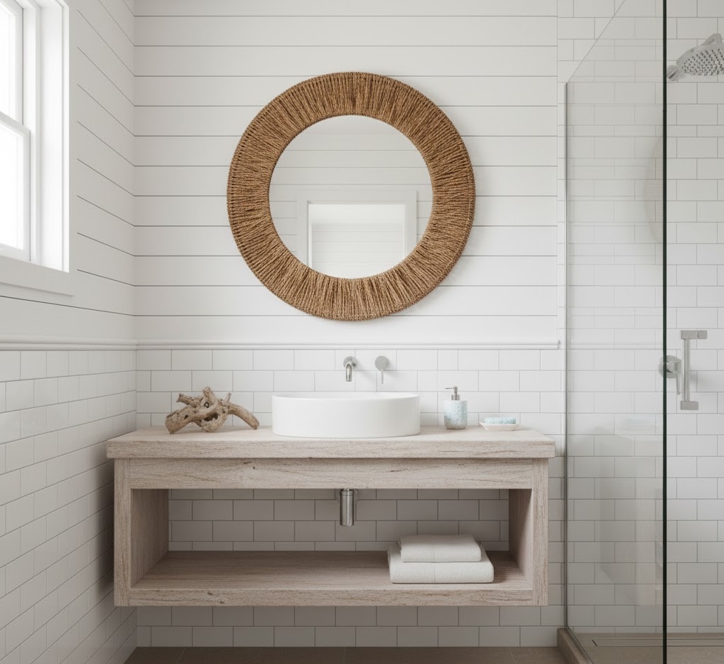 Bring the refreshing feel of the seaside into your home with coastal tiny bathroom ideas, perfect for creating a bright and airy atmosphere. This style draws inspiration from beach houses, featuring a palette of crisp whites, sandy beiges, and various shades of blue, from sky to deep navy. Natural materials like driftwood, rattan, and woven textures are prominent, alongside shiplap panelling or subway tiles. Functionality is enhanced by clever storage solutions, such as open shelving with woven baskets, keeping the space organised yet charmingly relaxed. The mood is light, breezy, and effortlessly inviting, making even the smallest bathroom feel like a coastal escape.