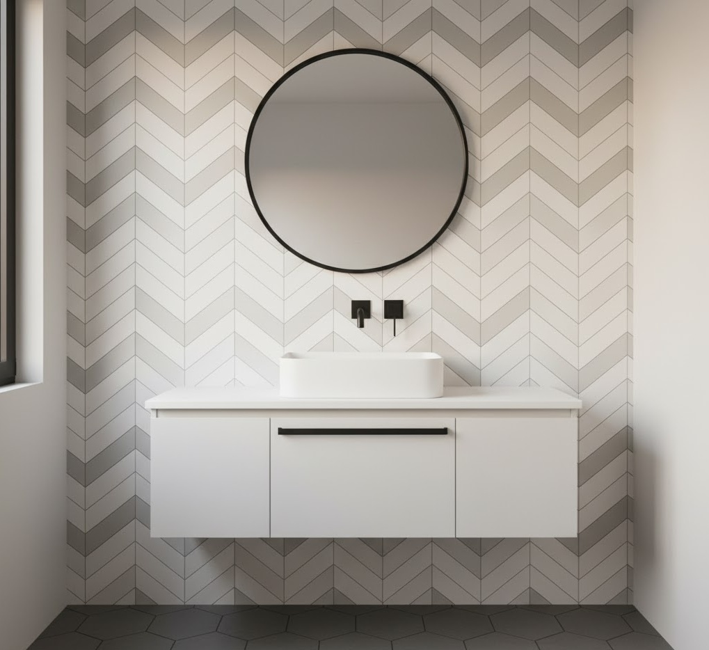 Make a bold visual statement with geometric small bathroom ideas, utilising patterns and shapes to add depth and interest. This style thrives on repetition and symmetry, creating a dynamic and modern aesthetic. A versatile colour palette can be used, from monochromatic schemes to vibrant contrasts, all unified by geometric motifs. Materials like patterned tiles (hexagonal, chevron, or mosaic), graphic wallpaper, and angular fixtures are central. Functionality is maintained through streamlined sanitaryware and clever storage that doesn’t detract from the visual impact. The mood is contemporary, energetic, and visually engaging, perfect for a small space that demands attention.
