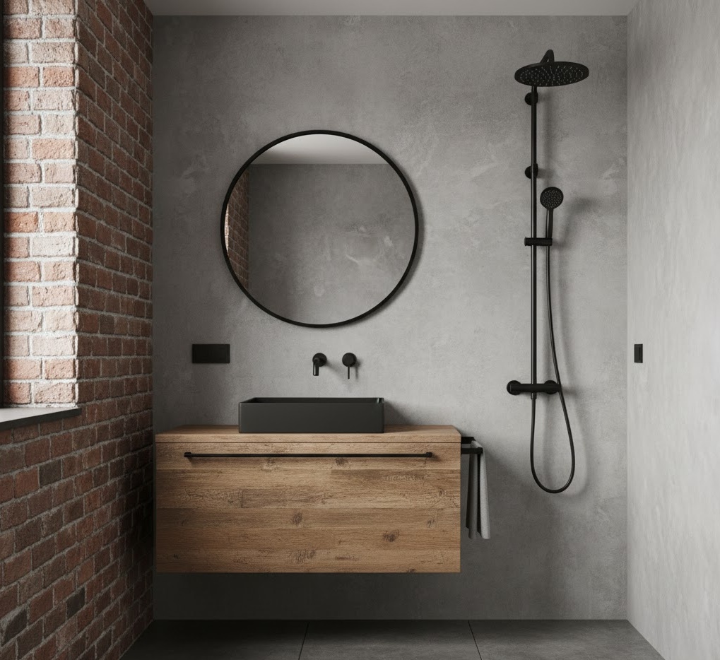 Embrace raw, urban appeal with an industrial small bathroom design, transforming a compact space into a stylish, edgy retreat. This look celebrates exposed elements and utilitarian materials, typically featuring a palette of greys, blacks, and metallic tones. Concrete, exposed brick, black metal, and reclaimed wood are key materials, often paired with subway tiles or dark grout for a rugged yet refined finish. Functionality is straightforward, with wall-mounted sinks and open shelving maximising space while showcasing the industrial aesthetic. The mood is cool, sophisticated, and distinctly modern, perfect for those who appreciate a no-nonsense, robust design.