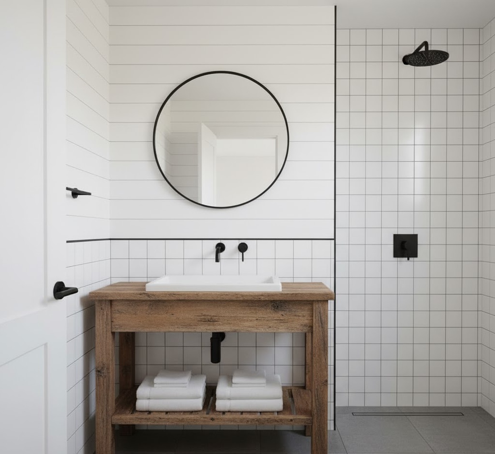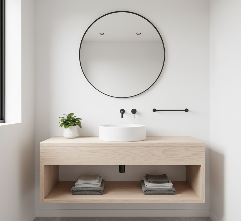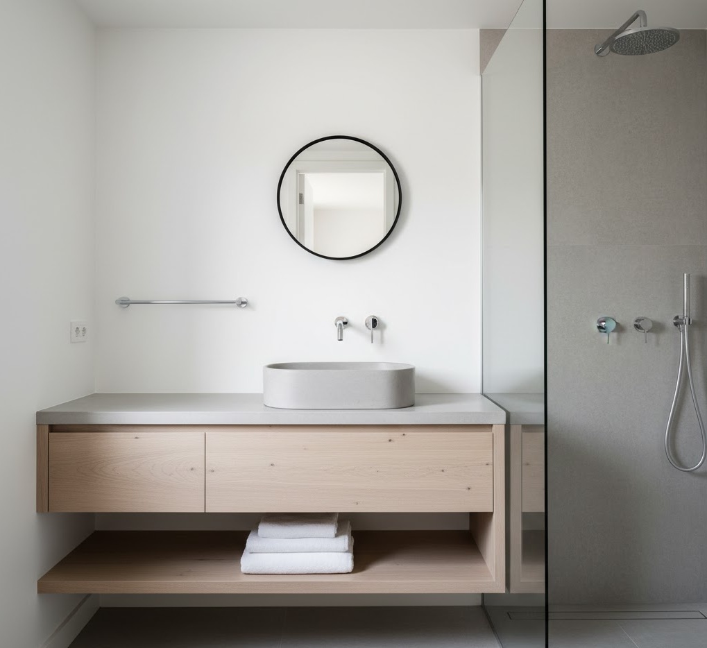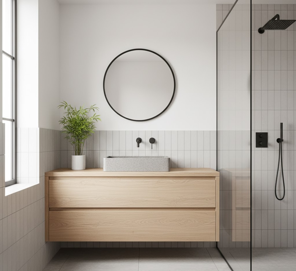 Discover the serene harmony of Japandi small bathroom design, a fusion of Japanese minimalism and Scandinavian warmth. This style prioritises simplicity, natural materials, and a calm, uncluttered aesthetic. The colour palette is muted, featuring soft whites, greys, and earthy tones, complemented by natural wood and black accents. Materials like light oak, bamboo, concrete, and subtle textured ceramics are key, creating a sense of organic elegance. Functionality is paramount, with integrated storage and clean lines ensuring a highly efficient and peaceful space. The mood is tranquil, balanced, and deeply calming, perfect for a small, mindful retreat.