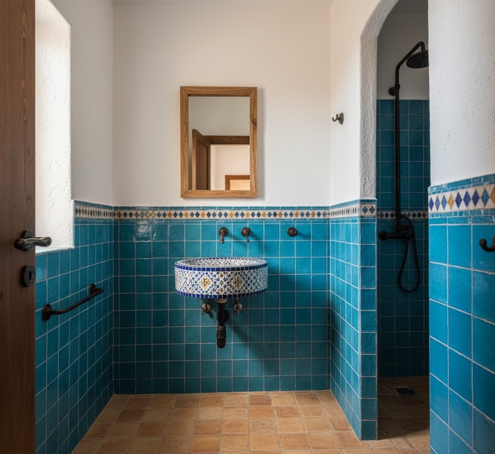 Transport yourself to sun-drenched shores with a Mediterranean small bathroom, even in a compact setting. This style is characterised by warm, earthy tones, vibrant blues, and natural textures, evoking the relaxed elegance of coastal Europe. A palette of terracotta, ochre, olive green, and azure blue is common, often paired with crisp white. Materials like terracotta tiles, mosaic accents, wrought iron, and natural stone are essential. Functionality is achieved through simple, robust fixtures and open shelving, maintaining an airy feel. The mood is inviting, vibrant, and wonderfully exotic, making a small bathroom feel like a holiday retreat.