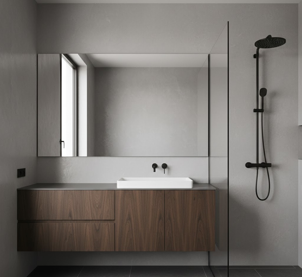 Create a sleek and sophisticated space with an urban contemporary bathroom design, ideal for modern city living in a small footprint. This style embraces clean lines, functional design, and a sophisticated, often monochromatic, colour palette. Greys, blacks, and whites are dominant, frequently accented with metallic finishes like brushed steel or matte black. Materials such as polished concrete, large format tiles, glass, and dark wood are characteristic, lending a refined, industrial edge. Functionality is paramount, with wall-mounted fixtures and integrated storage maximising space and maintaining a streamlined look. The mood is chic, efficient, and distinctly modern, perfect for a compact urban dwelling.