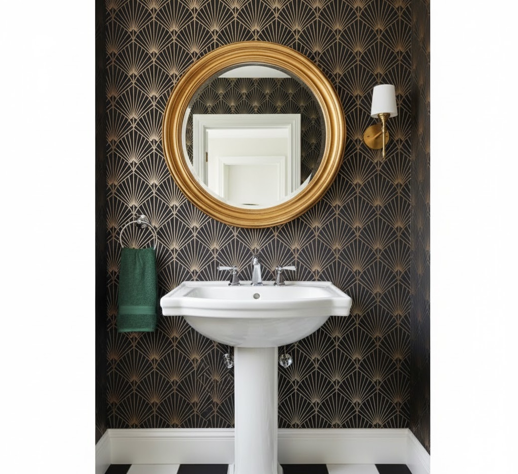 Add a touch of vintage glamour to your small space with an Art Deco budget bathroom nook, celebrating geometric patterns and luxurious accents. This sophisticated style often features a palette of black, gold, and emerald green, creating a dramatic and opulent atmosphere. Mirrored surfaces and bold, symmetrical patterns are key, enhancing the sense of luxury. The mood is sophisticated and undeniably opulent, transforming your bathroom into a chic, jewel-box space. Functionality is delivered through compact, elegant fixtures and clever use of reflective surfaces to expand the room visually. Affordable geometric patterned wallpaper and gold accents bring this lavish look within reach.