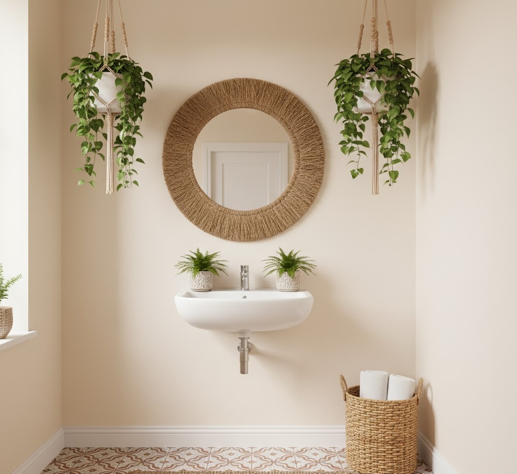 Unleash your inner free spirit with a boho chic bathroom on a budget, a style that thrives on an eclectic mix of textures, patterns, and natural elements. Earthy tones like terracotta, olive greens, and creamy whites form the foundation, often complemented by vibrant pops of colour. The mood is relaxed, artistic, and wonderfully unconventional, inviting a sense of wanderlust into your daily routine. Functionality is creatively addressed with open shelving, woven storage baskets, and repurposed furniture, adding character and practicality. Affordable touches like patterned peel-and-stick tiles, macrame wall hangings, and an abundance of lush plants bring this vibrant look to life.