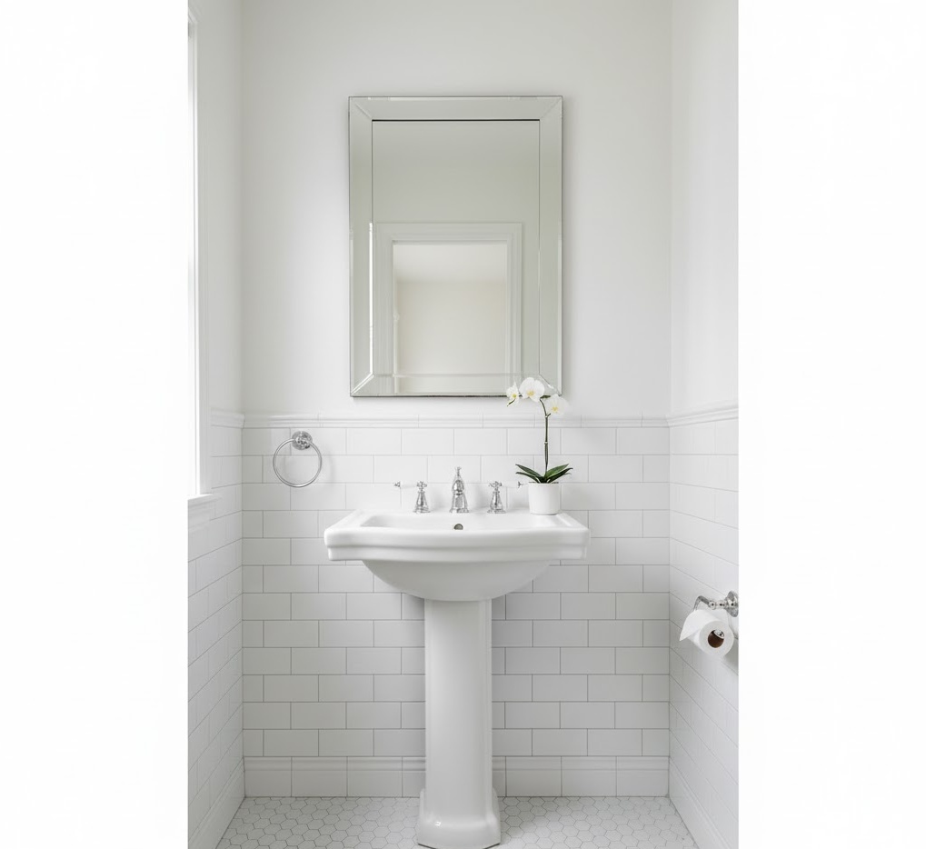 Embrace timeless elegance with a classic white small bathroom, a perennially popular choice that maximises light and creates an illusion of space. This style is defined by its pristine all-white or off-white palette, often paired with classic subway tiles and gleaming chrome fixtures. The mood is fresh, clean, and effortlessly elegant, providing a serene backdrop for your daily rituals. Functionality is inherent in its simplicity, as the bright surfaces reflect light, making even the tiniest room feel more expansive. Utilising inexpensive white subway tiles, white paint, and basic white sanitaryware ensures this sophisticated look remains firmly within budget.